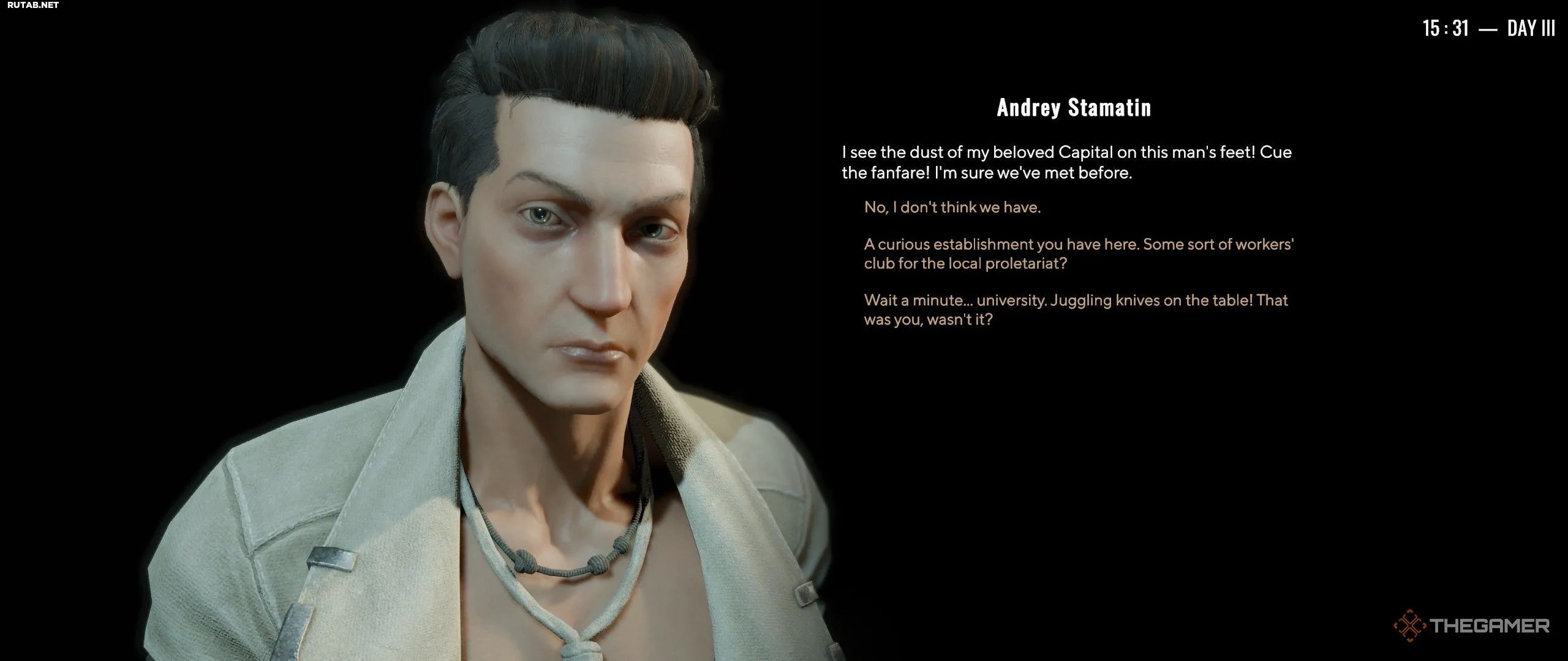 Внутри бара поговорите с Андреем Стаматиным за стойкой, чтобы узнать о степном лекарстве и его применении на танцовщице, выступающей в зале. После этого разговора настанет время опросить саму танцовщицу.
