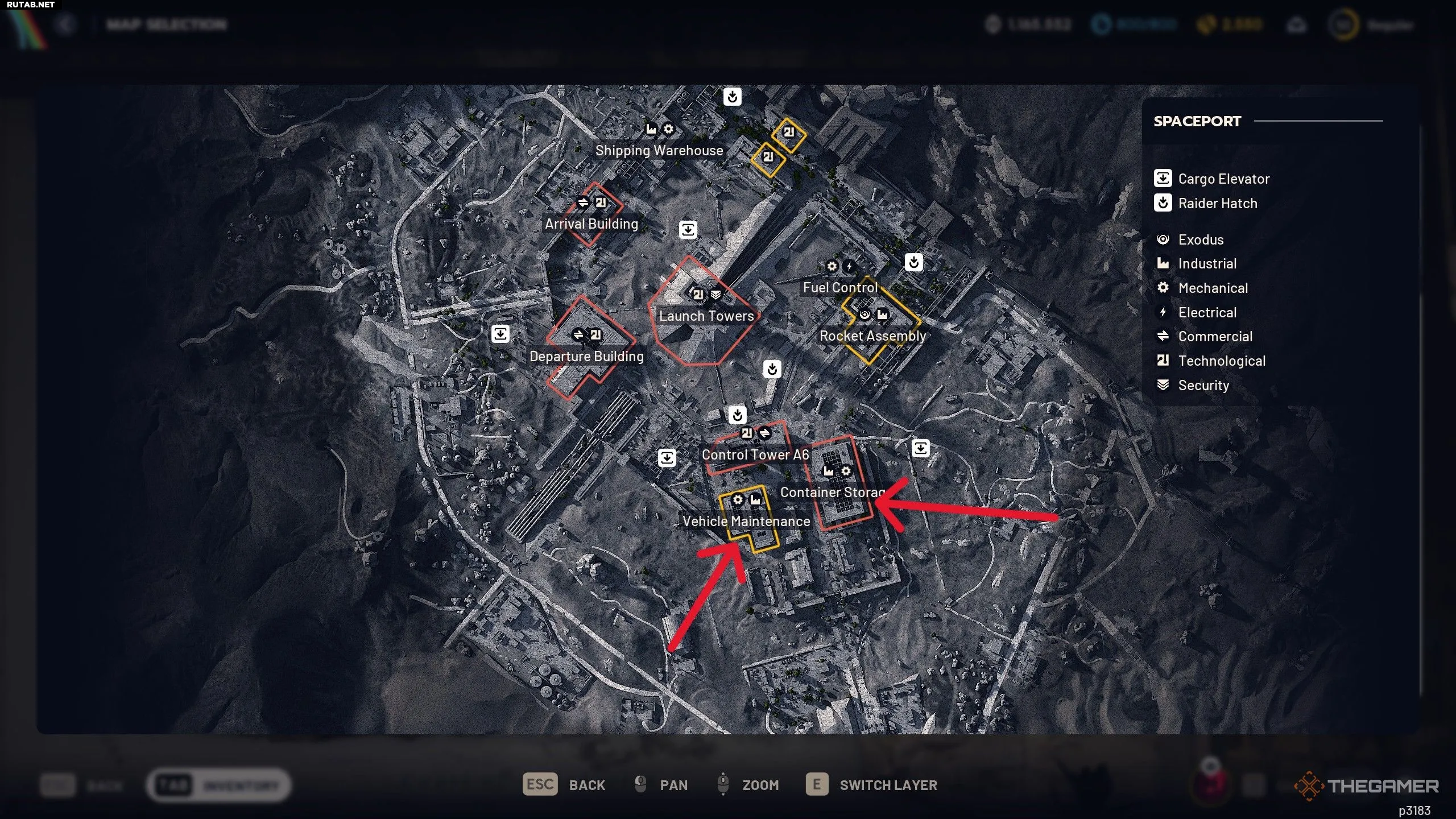 На Космопорте исследуйте восточную часть карты. В зонах «Техобслуживание транспорта» и «Контейнерный склад» много взламываемых ящиков, машин и механизмов. В «Техобслуживании» проверяйте оба этажа. «Контейнерный склад» богат добычей, но это популярная PvP-зона — будьте готовы к встрече с игроками.