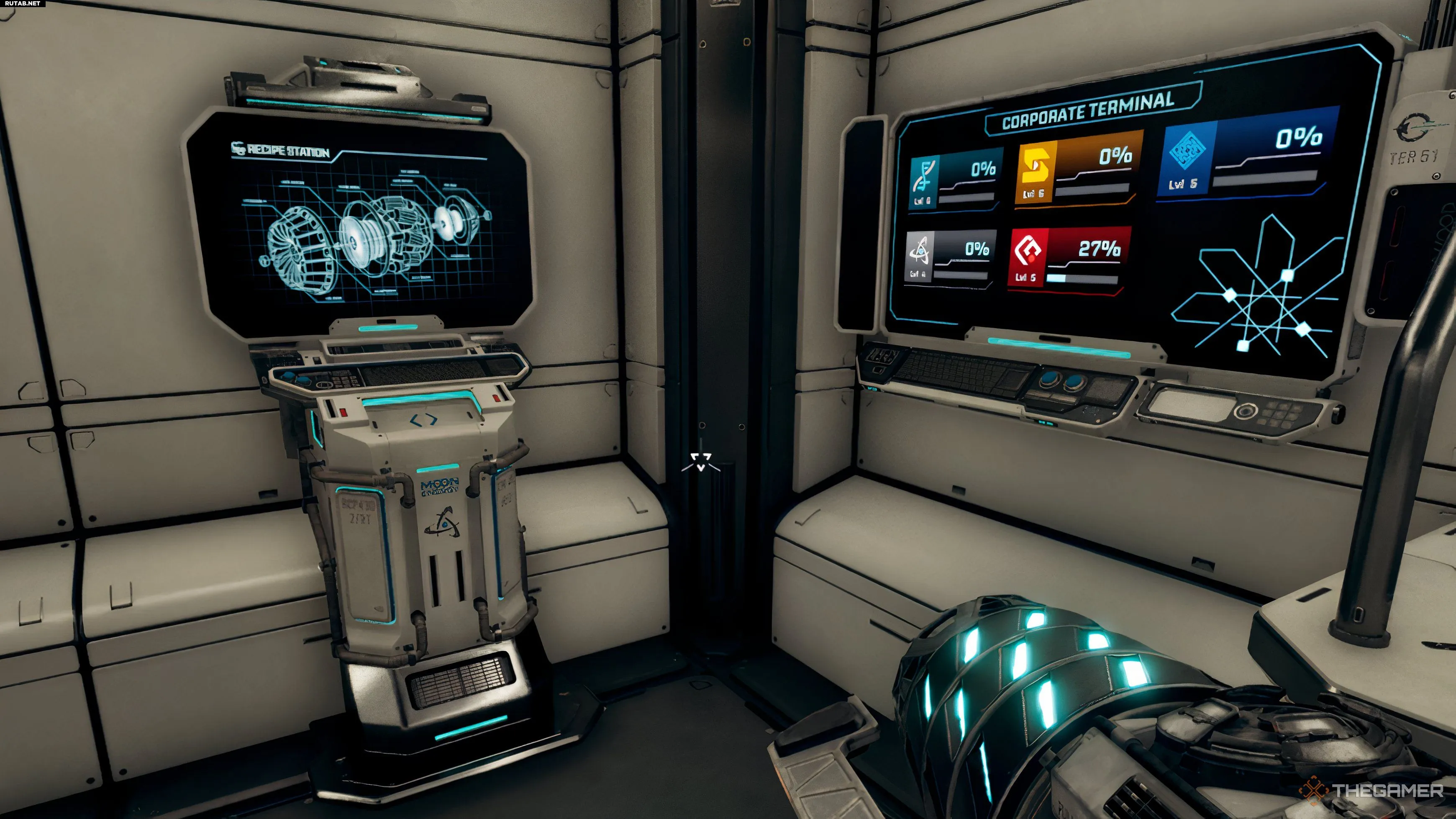 Потратить очки данных можно в двух местах: на станции рецептов и на корпоративном терминале. Станция рецептов позволяет разблокировать новые предметы для крафта, а также еду и напитки для пополнения калорий, гидратации и здоровья.