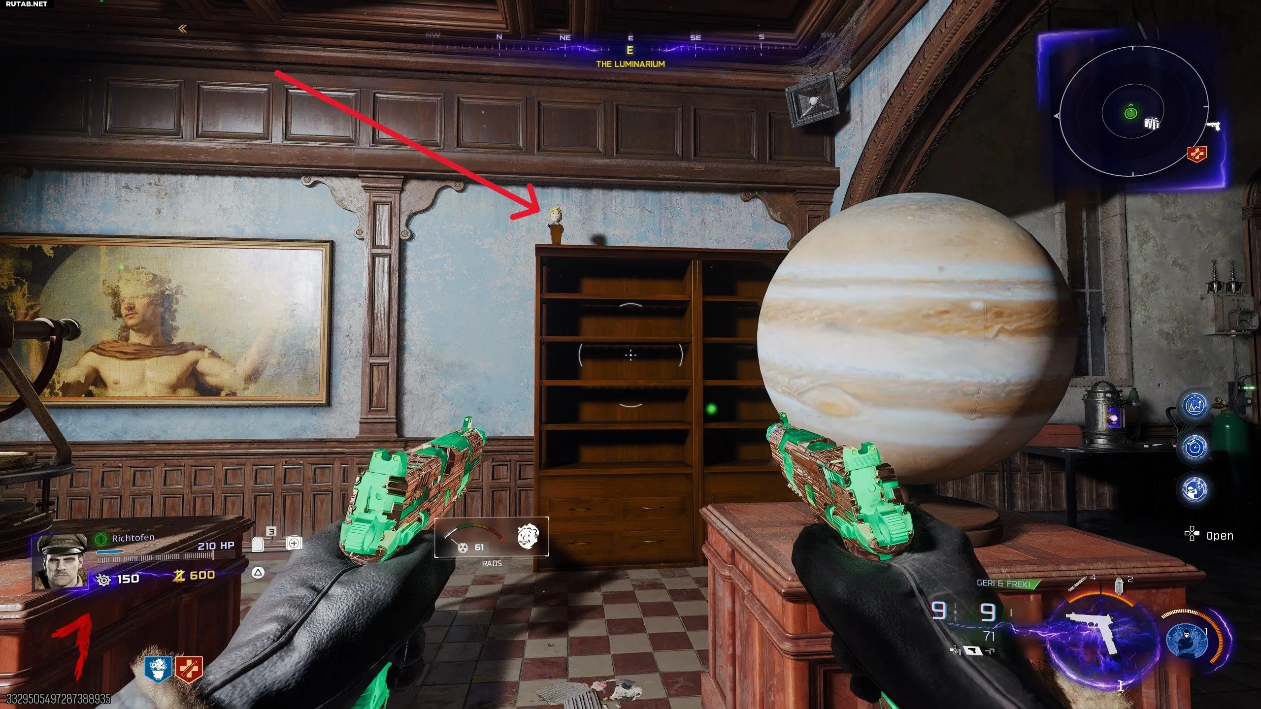 Находясь в Люминарии, где расположен автомат Jugger-Nog, повернитесь лицом к восточной стене и посмотрите вверх на книжную полку напротив модели Сатурна. Выполните прыжок от стены у этой полки, чтобы схватить последнюю фигурку.