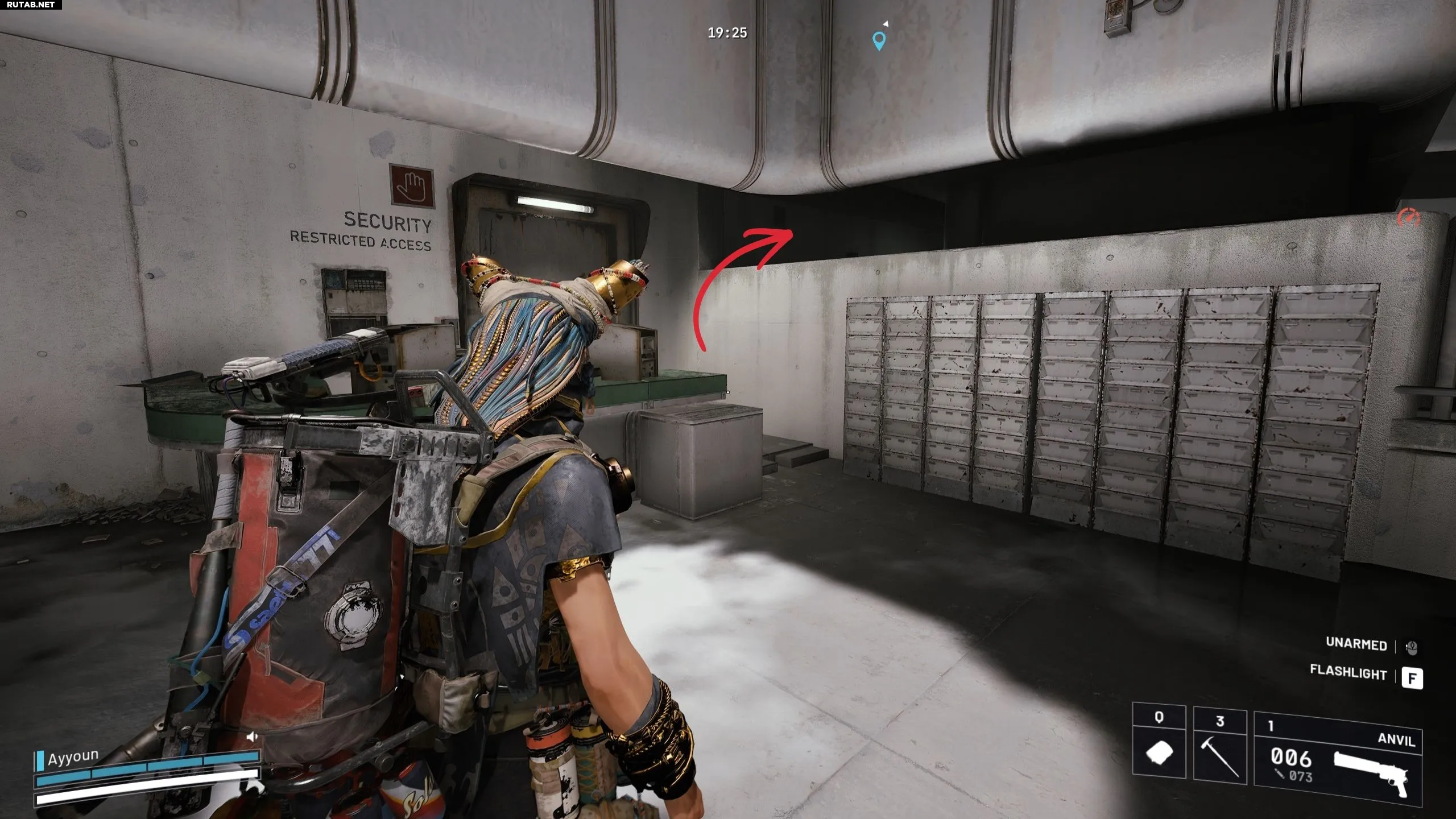 Если вы появились рядом, просто перепрыгните через небольшой выступ возле взламываемой двери КПП и пройдите внутрь. В соседней комнате вы найдете множество черных контейнеров, шкафов и квадратных оружейных сейфов.