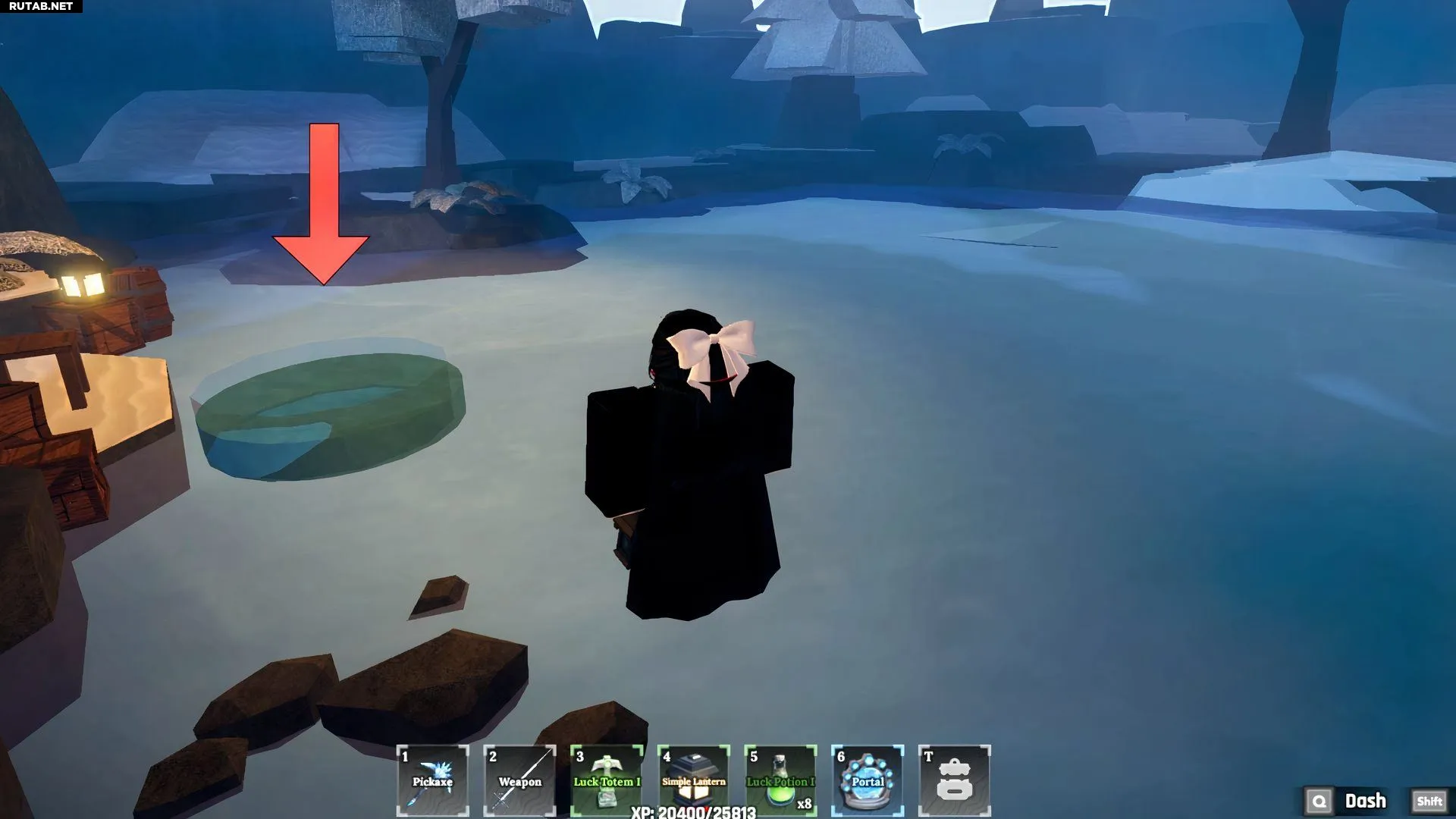 После телепортации на локацию двигайтесь на юг от точки появления, пройдите мимо NPC Бьорна и идите к краю суши, где виден ледяной замок. Затем поверните направо на восток. Примерно на середине пути сверните на юг к замерзшему озеру. Найдите небольшой круглый пруд и нырните в него, чтобы попасть в скрытое подземелье.