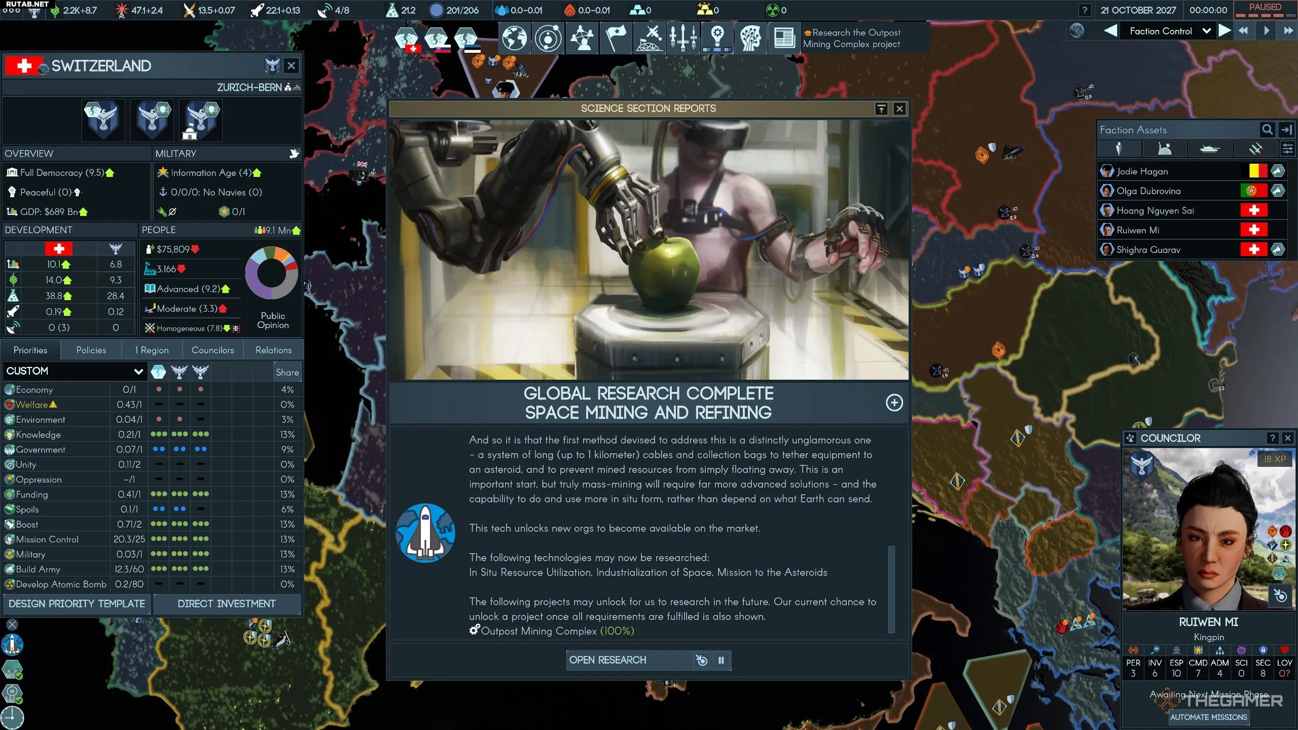 | Наука | В отличие от большинства ресурсов, наука генерируется, но не накапливается. Она немедленно тратится на текущие исследовательские проекты, причём весь ваш ежедневный доход уходит в выбранные проекты. | Основной источник — страны через инвестиции в приоритет Знания, также зависит от общей экономики и образования страны. Некоторые организации также генерируют науку. | Автоматически тратится на текущие исследовательские проекты. Вы можете выбрать любое количество проектов для инвестирования. Чем меньше проектов, тем больше науки получает каждый из них. |