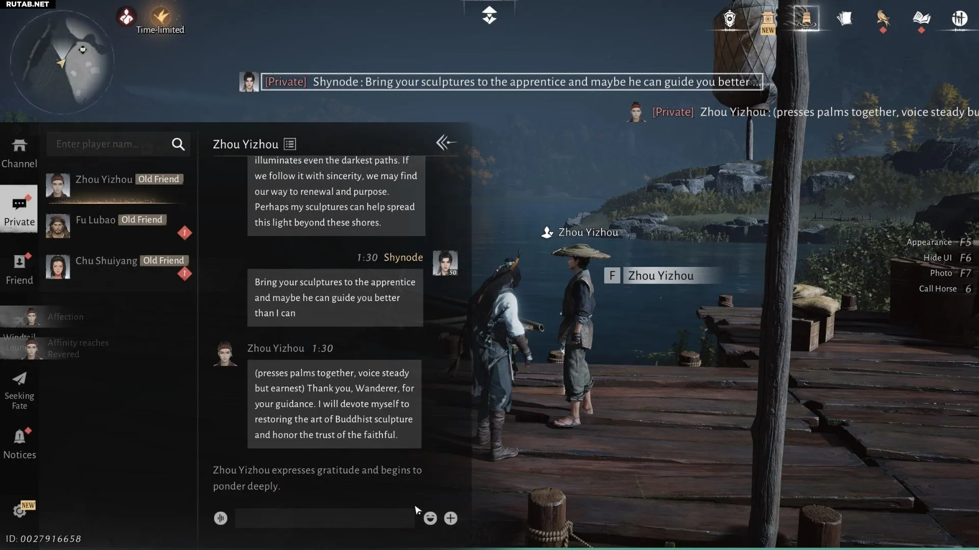 Чжоу Ичжоу — скульптор и набожный буддист, большой поклонник Чань-мастера Мяошаня, важной фигуры в лоре игры. Лучший способ повысить его расположение — войти в роль религиозного человека и апеллировать к его интересам. Ниже приведена стенограмма разговора, которая в нашем случае привела к достижению 100 очков расположения и статуса «Почитаемый».