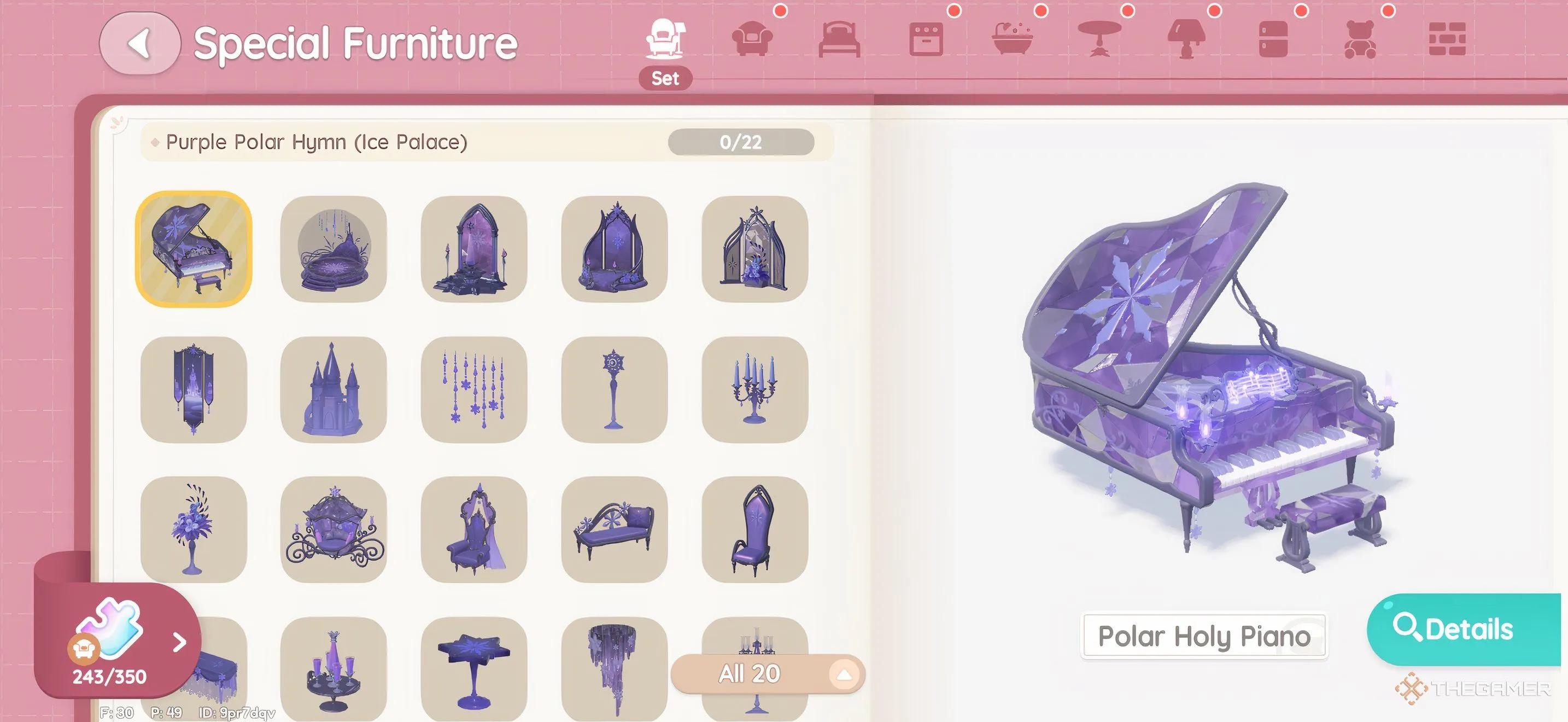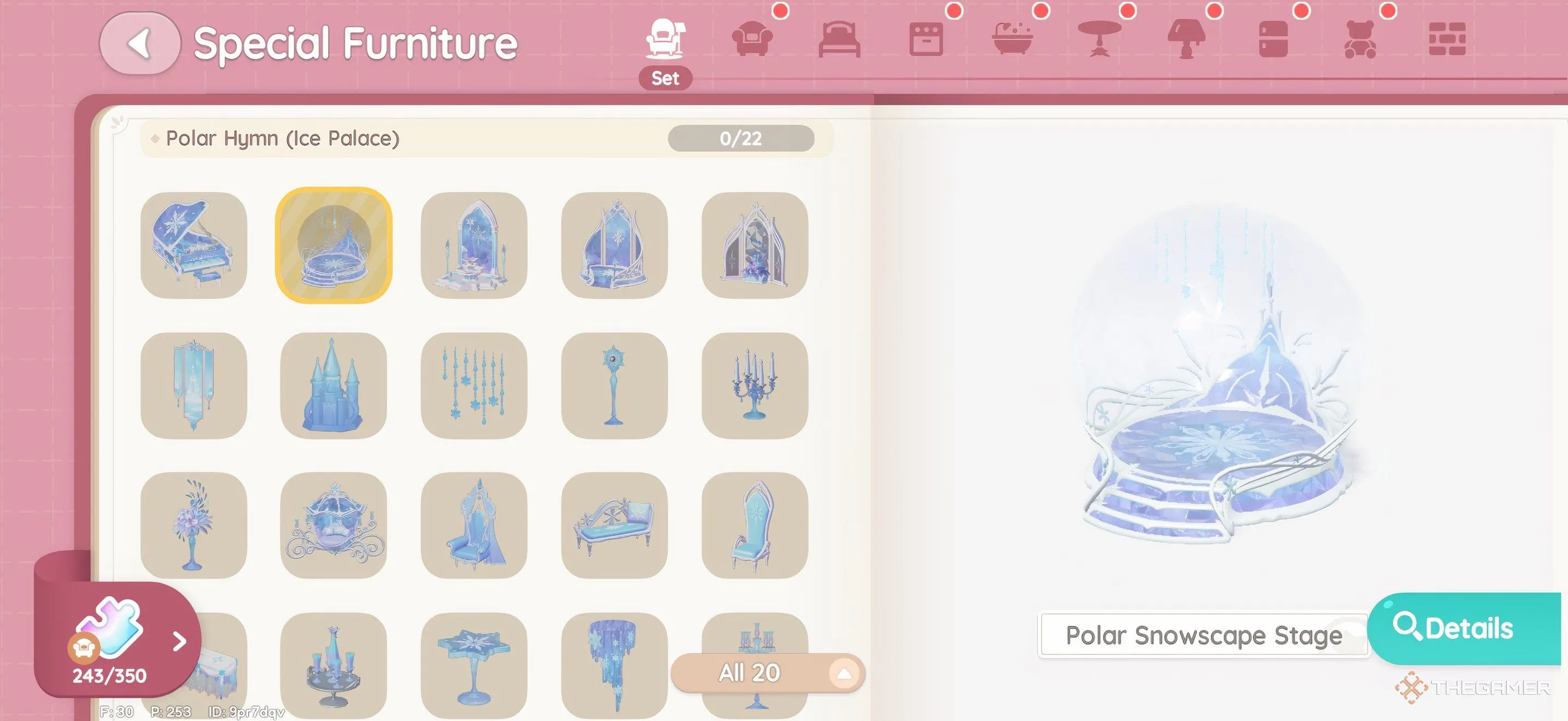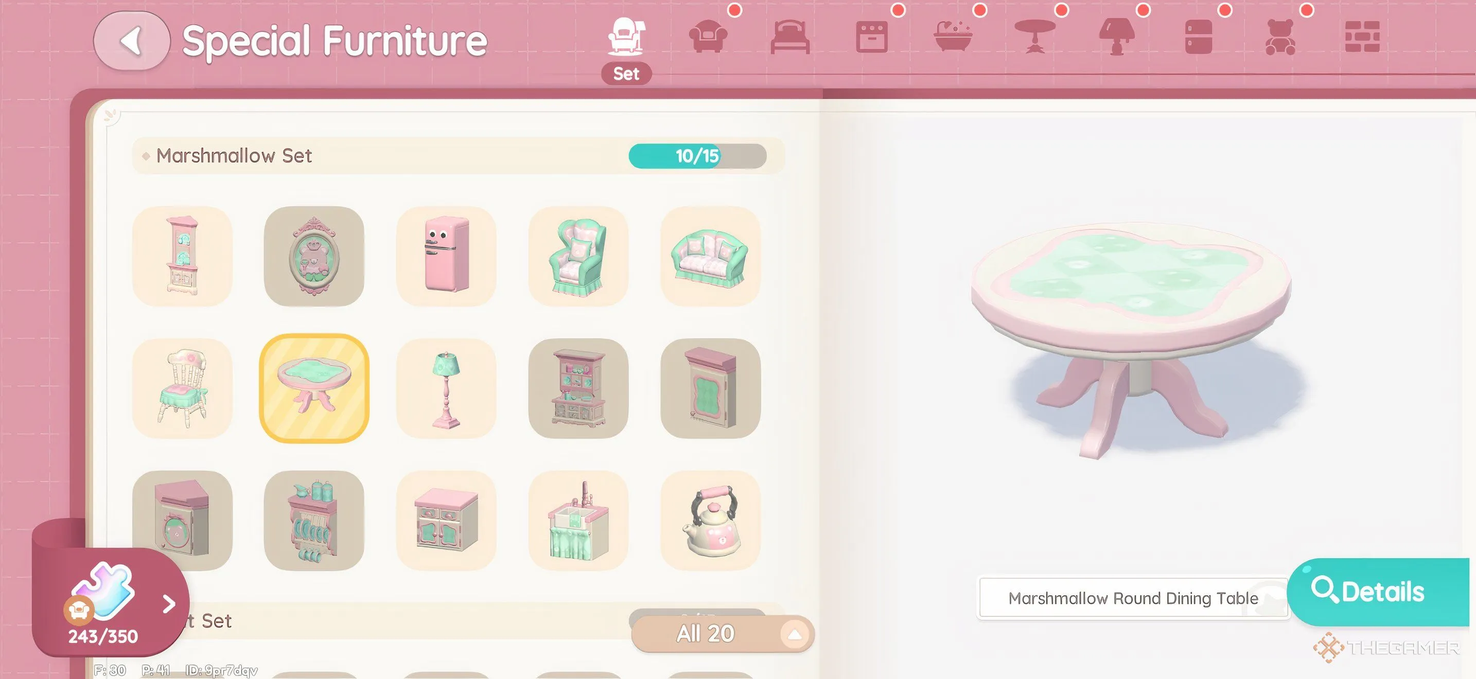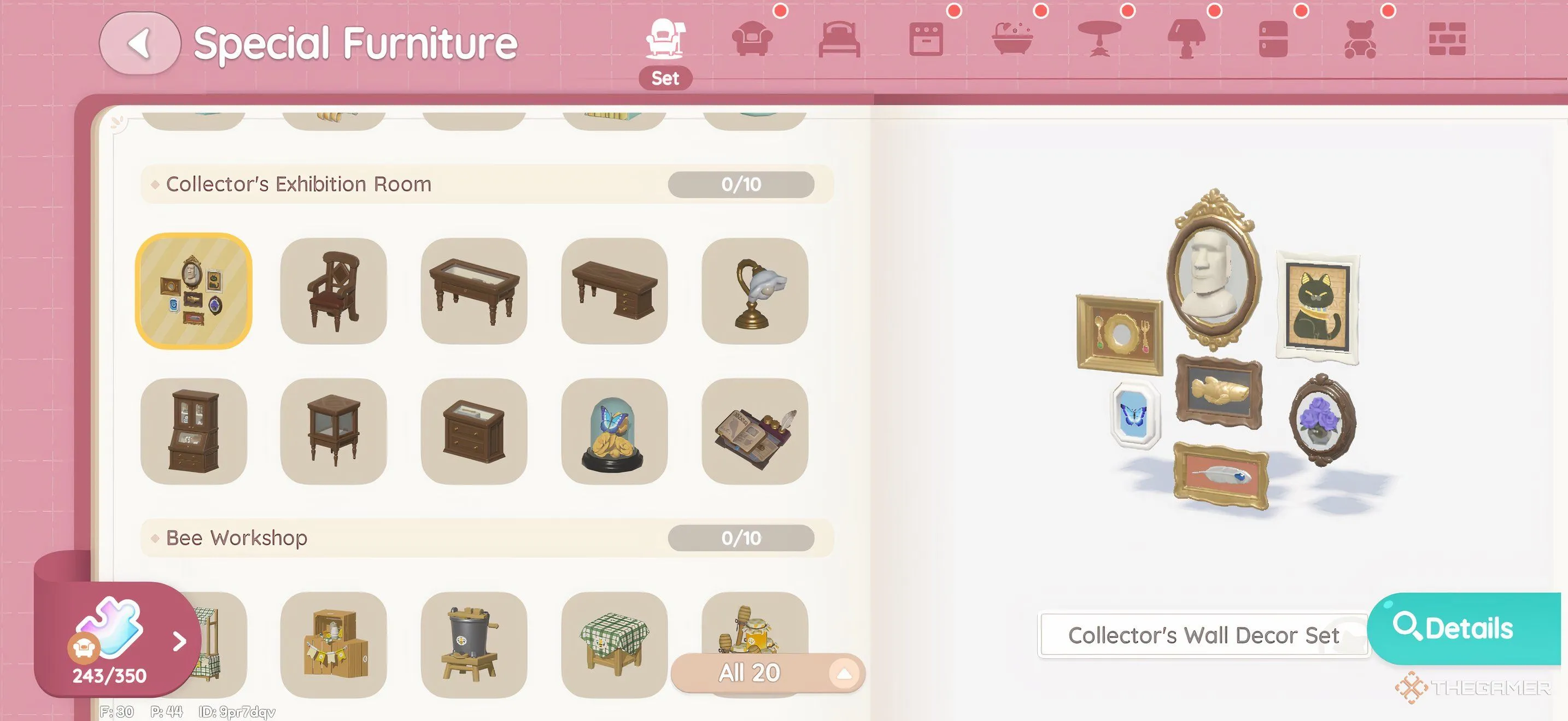 Некоторые наборы мебели появляются во временных магазинах или событиях. Если для набора требуются очки коллекции, в первую очередь выполните задания Гильдии членов D.G., чтобы получить доступ к этим наградам.