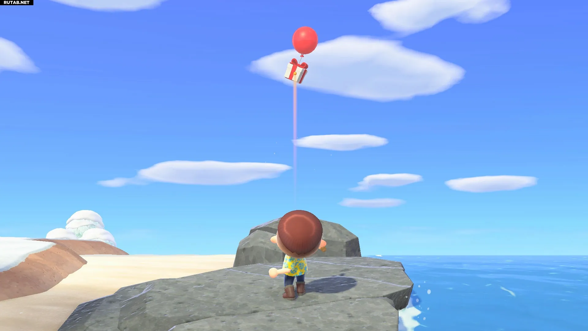 Поднимите правый стик вверх, чтобы увидеть линию горизонта, и осмотрите небо в поисках летящего воздушного шара, или ищите на земле движущуюся тень. Чтобы его сбить, понадобится рогатка — её рецепт можно купить в магазине «Нук энд Ко» или у Томми в центре резидентских услуг. Когда вы собьёте шар, внутри вас будет ждать подарок. Только следите, чтобы он не упал в реку — хотя за такое действие даже предусмотрена награда в виде миль Нука.