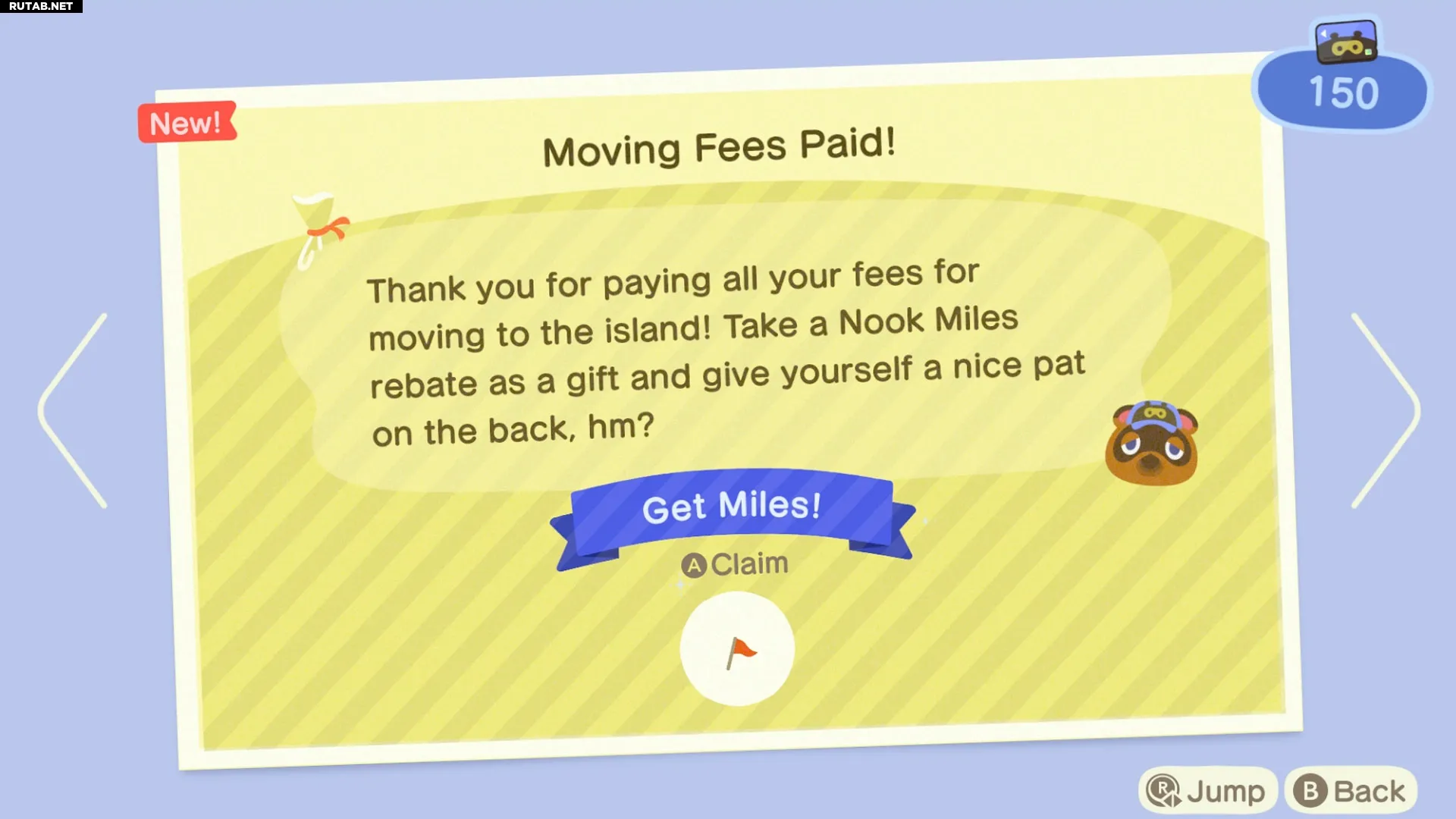 В ваш первый полный день на острове Том Нук выставит вам довольно крупный счёт за переезд. К счастью, его можно оплатить милями Нука — и всего 5000 миль. Мы советуем сделать это самым первым делом. После выплаты долга перед мистером Нуком откроется целый ряд новых возможностей. Во-первых, вы сможете взять новый кредит, который автоматически позволит вам улучшить палатку до дома. Это заём в 98 000 колокольчиков, но ваш новый дом будет построен уже к следующему утру, и тогда можно начать его погашение. Это откроет доступ к встроенному хранилищу в доме, что очень удобно.