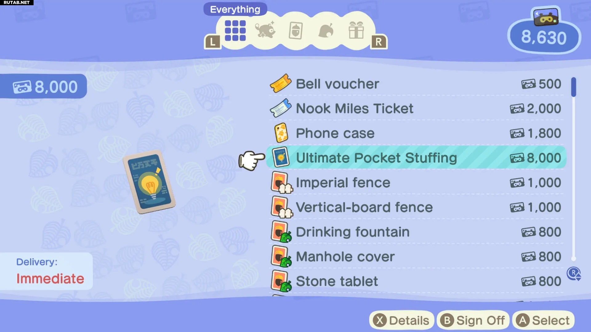 За мили Нука можно приобрести множество полезных вещей, но мы советуем в первую очередь обратить внимание на улучшение инвентаря. В терминале «Нук Стоп» в центре резидентских услуг в разделе «Потратить мили Нука» найдите пункт «Руководство по организации карманов» стоимостью 5000 миль. Эта покупка добавит вам дополнительный ряд слотов в инвентаре, что станет огромным подспорьем в повседневной островной жизни.