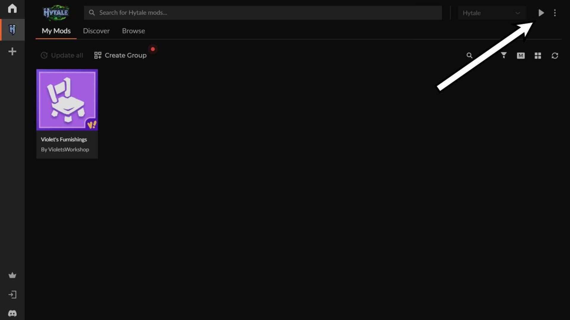 - Нажмите на значок воспроизведения рядом с Hytale в правом верхнем углу, чтобы запустить игру с модами.
