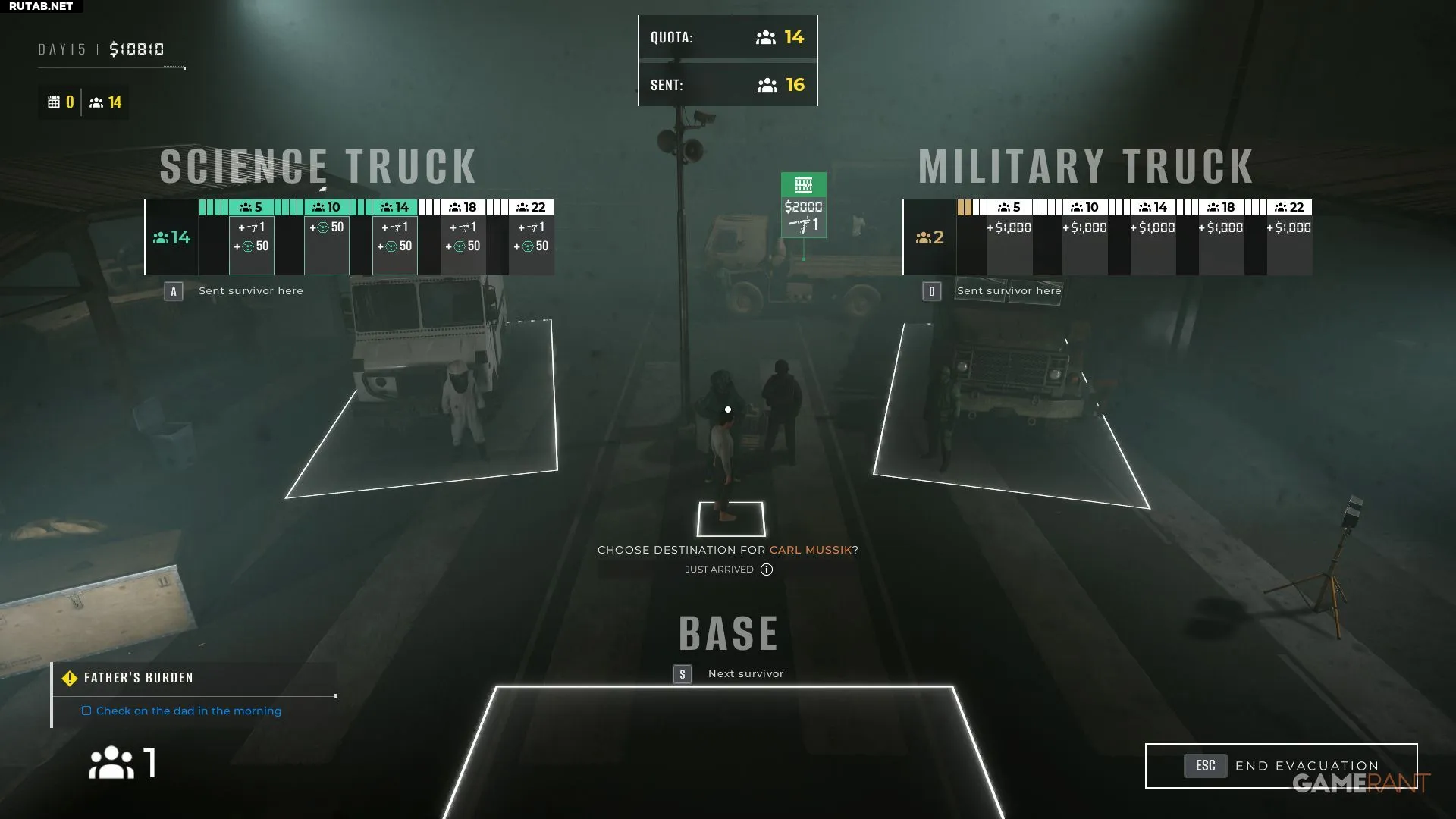 На эвакуации нужно отправлять больше выживших учёным (в научный грузовик). В награду вы получите очки исследований и шприцы-анализаторы, в отличие от денежной награды за отправку выживших военным.