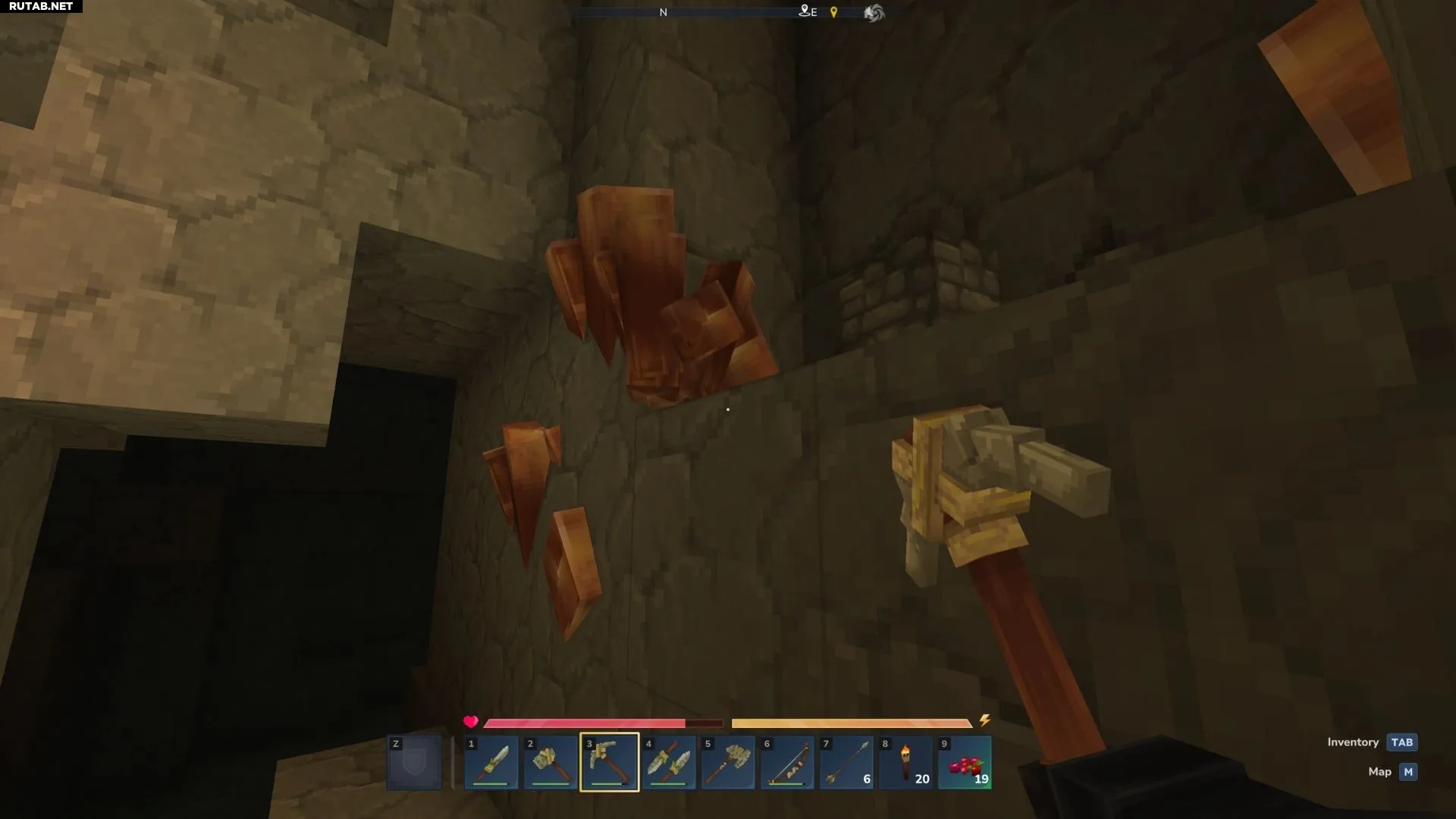 Медь — это руда самого низкого уровня, поэтому добывать её можно Грубой киркой. Её можно скрафтить в меню крафта инвентаря (TAB), используя Булыжник (2), Волокно растения (2) и Палку (2).