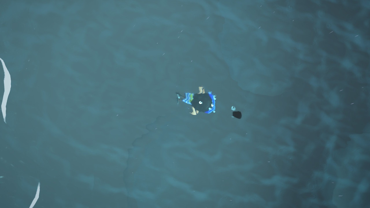Другой способ ловли — нырнуть и поискать маленькие тени под водой. При погружении камера наклонится, давая вам лучший обзор того, что внизу. Столбики пузырьков и тени совпадают, поэтому проще нырнуть и поплыть прямо к тени. Ваш персонаж автоматически соберёт то, что там находится, как только достигнет цели.