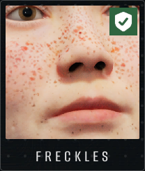 Проявляется как большое количество мелких, обычно коричневых или оранжевых точек на лице выжившего, на щеках и носу.