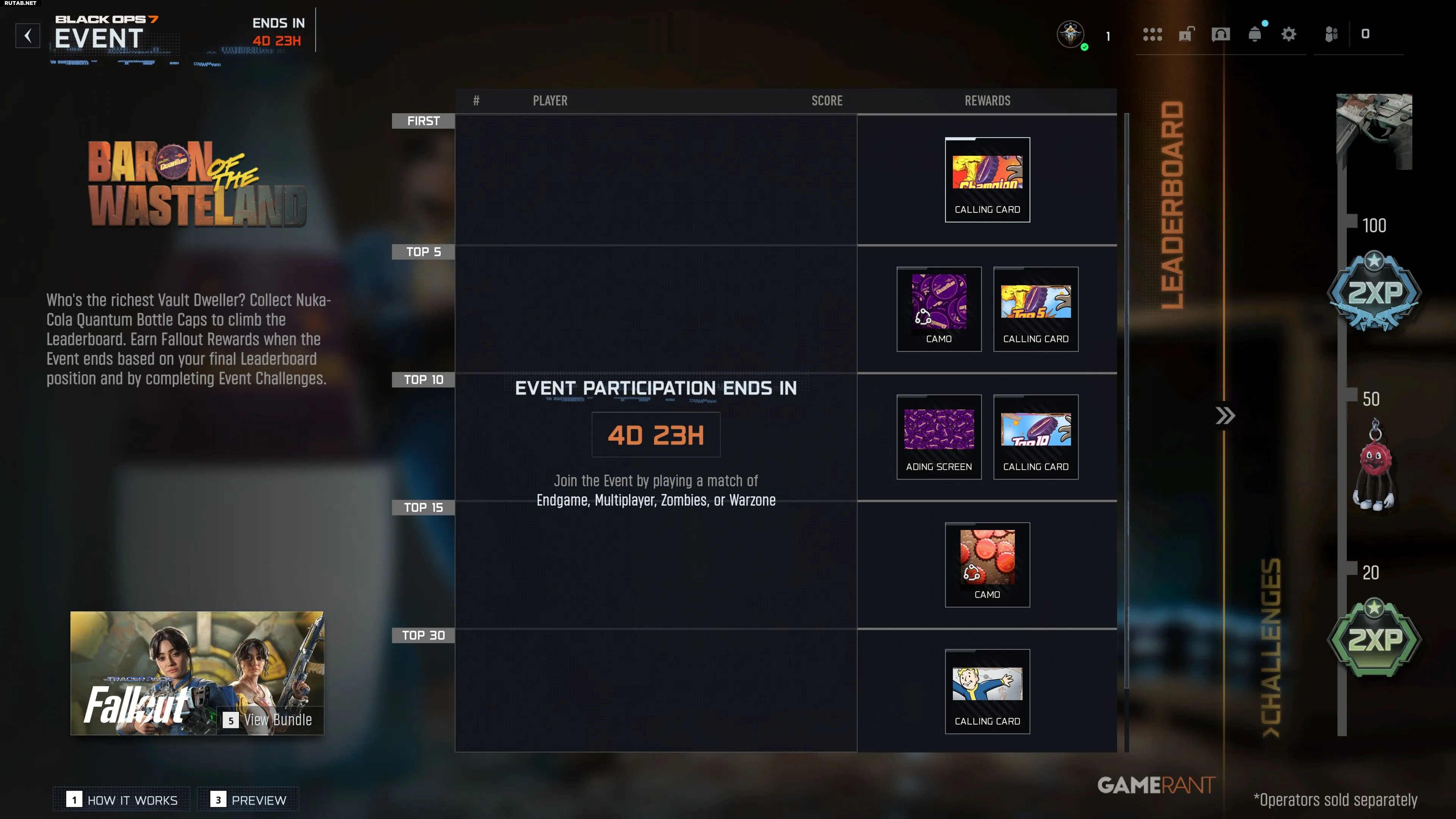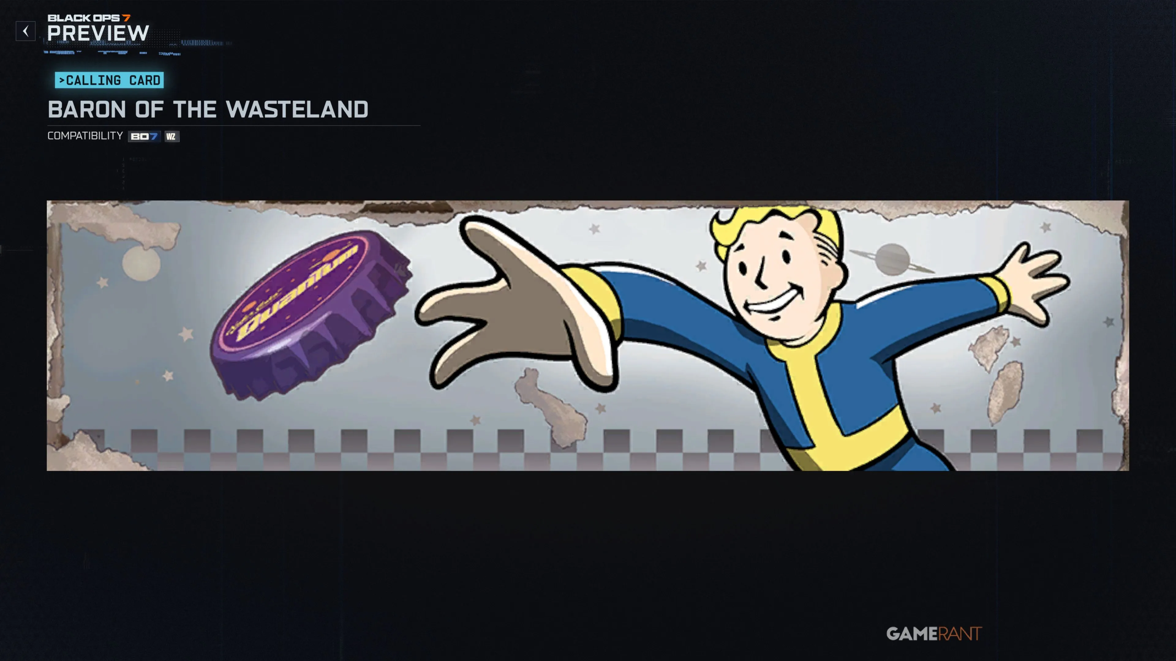 «Барон Пустоши» — это событие с турнирной таблицей, которое проходит параллельно с «Квантовым обменом». Игроки попадают в группу из 30 человек. Чтобы подняться в рейтинге, необходимо собирать крышки от бутылок Nuka-Cola Quantum.