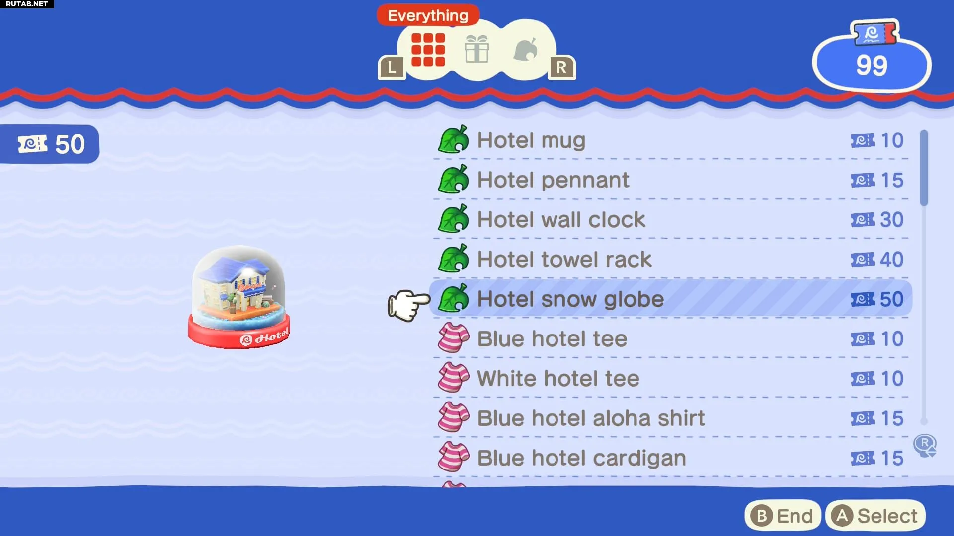 Как и в «Нук Шоппинге», через сувенирный каталог отеля нельзя заказать неограниченное количество товаров. Поговорив с Бабушкой Грэмс, можно заказать максимум пять предметов в день. Однако это лимит на одного жителя острова. Если у игрока есть второй пользователь на консоли, он может войти в игру под ним и заказать себе дополнительные предметы из каталога.