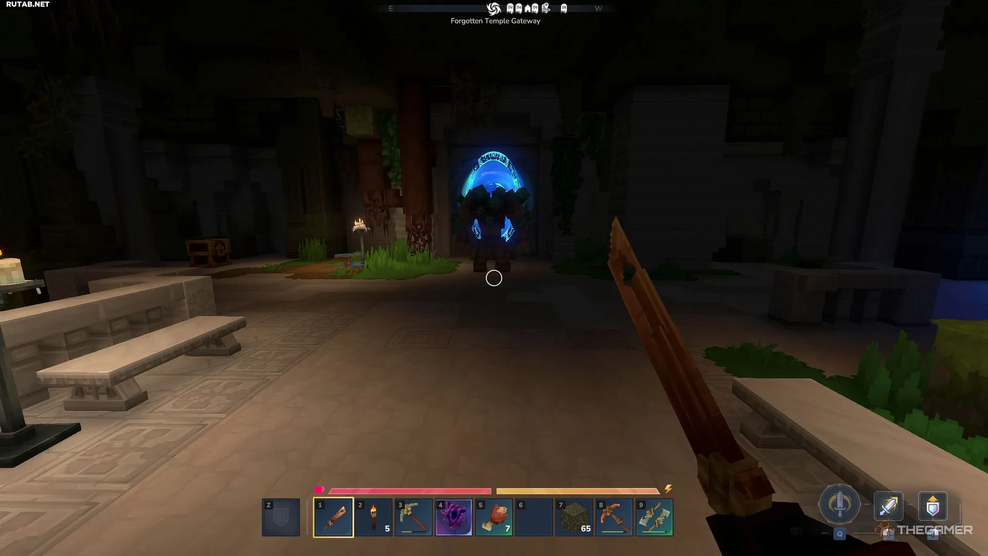 Попав внутрь через главный вход, спуститесь по лестнице. Внизу вы найдете голема, охраняющего портал. Победите его и войдите в портал, который перенесет вас в Забытый храм.