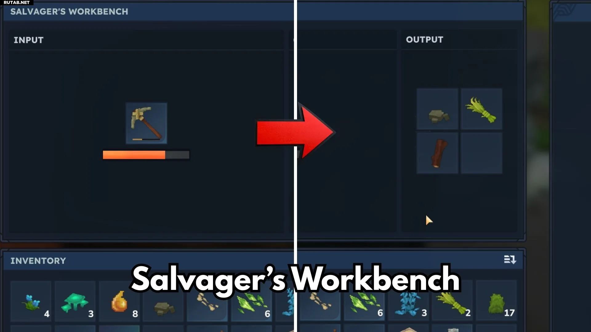Например, если поместить в него «Грубую кирку», вы получите немного «Обломков», «Растительного волокна» и «Палок». Это лучший способ избавиться от старых сломанных инструментов.