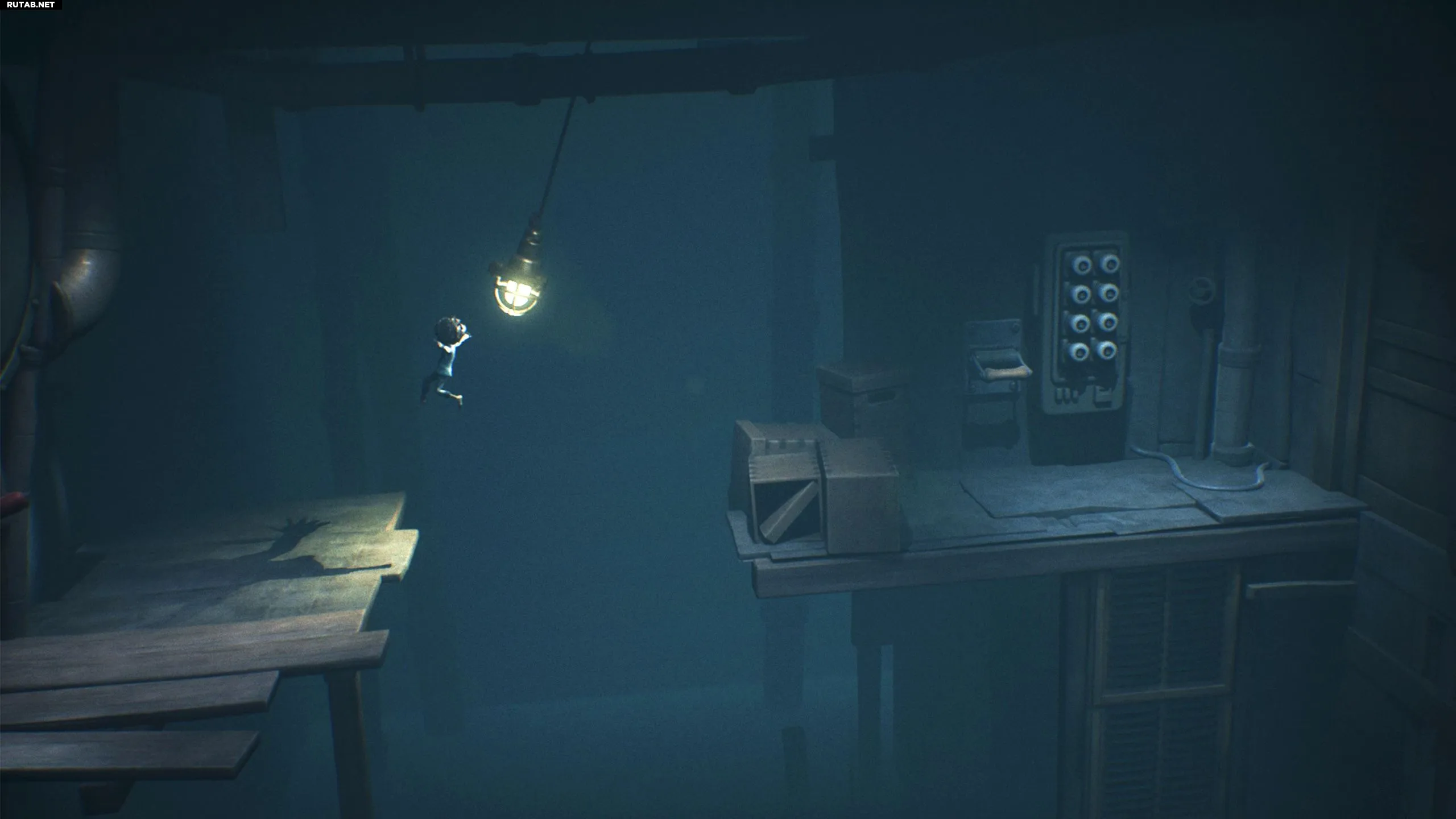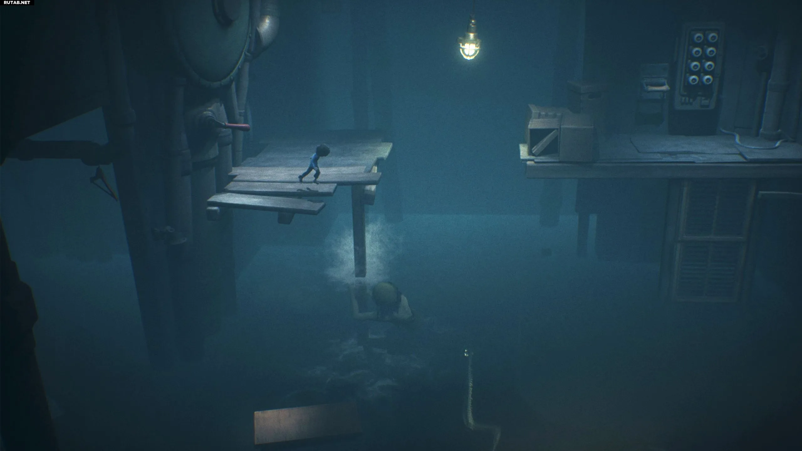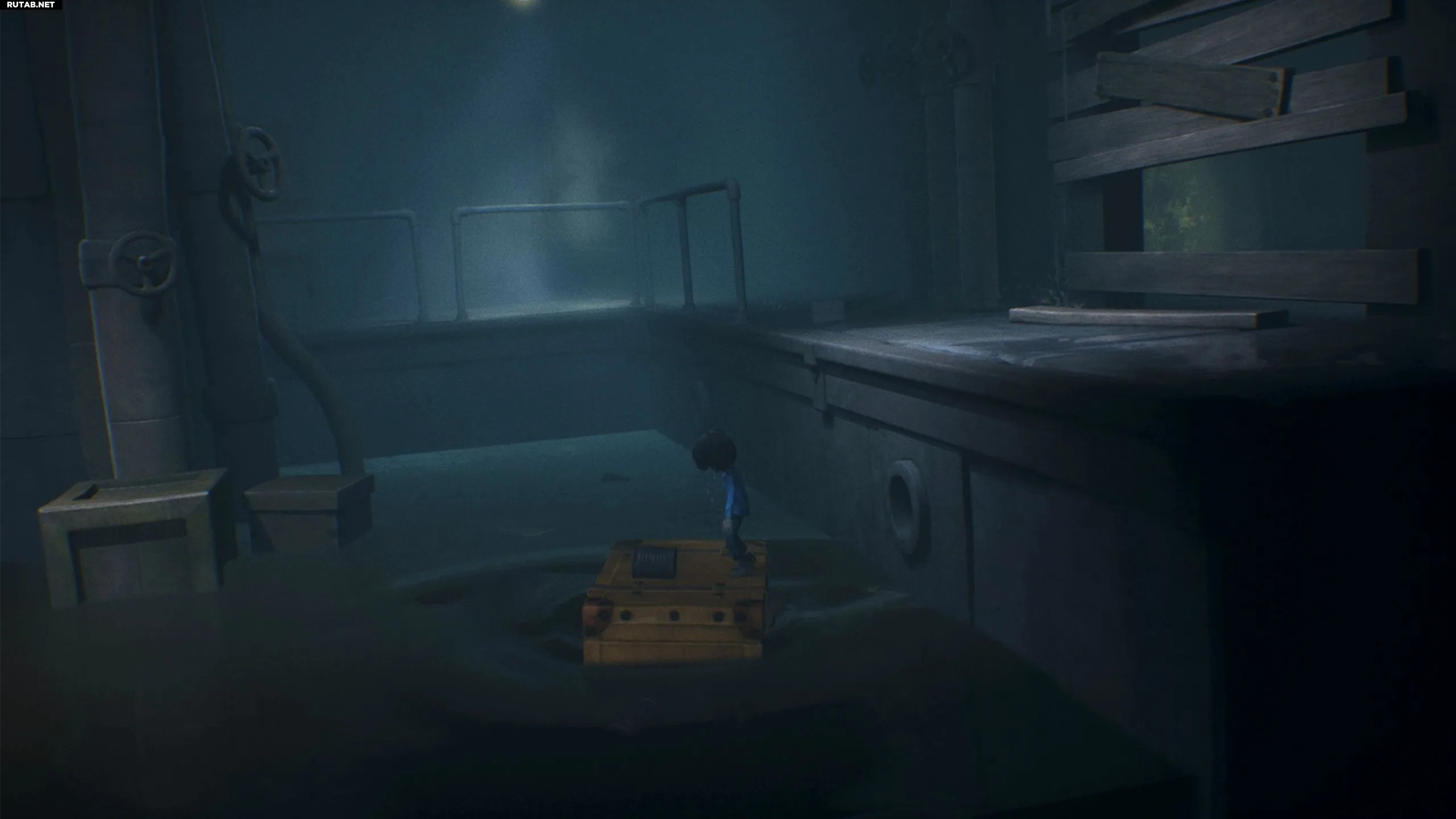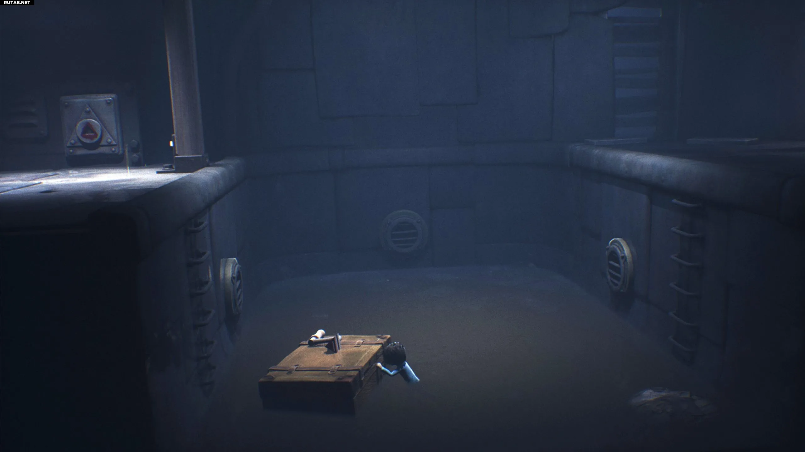 Используйте ящики, мебель и бочки, чтобы не оставаться в воде подолгу, но и не задерживайтесь на них слишком сильно — монстр будет трясти платформу, чтобы сбросить Малыша.