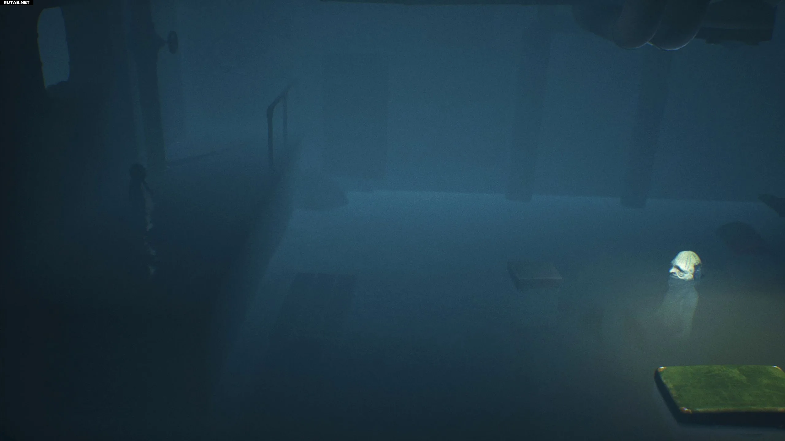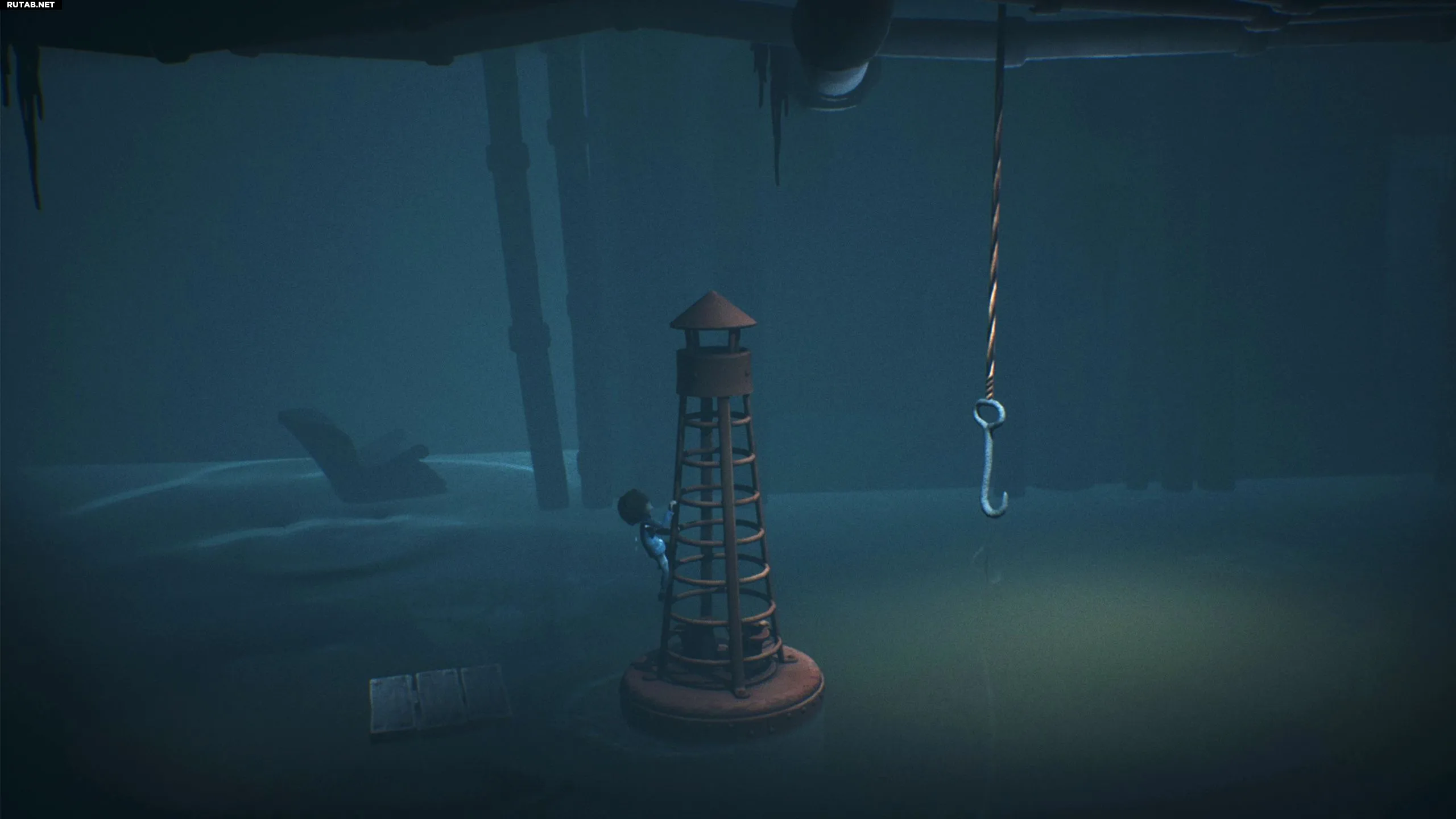 Продолжайте движение, чтобы попасть в ещё одну большую зону, заполненную водой, где под поверхностью скрывается невидимое чудовище. Используйте плавающие предметы, чтобы забраться на ближайшую платформу.