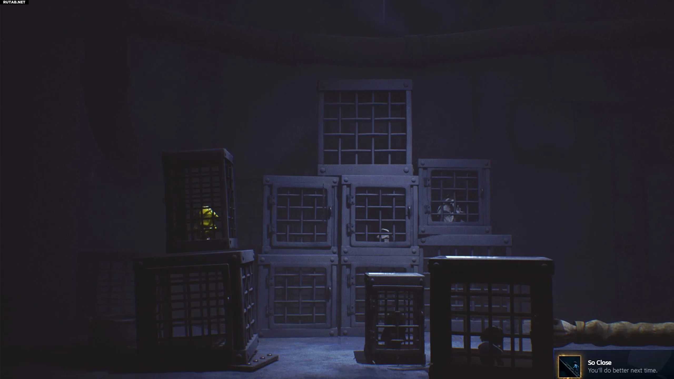Поднимитесь по лестнице и взберитесь по лестнице-стремянке, где вас поймает Смотритель. На этом глава «Глубины» завершится, и вы откроете достижение «Так близко». Малыш оказывается в клетке рядом с местом, где находится Шестёрка во второй главе.