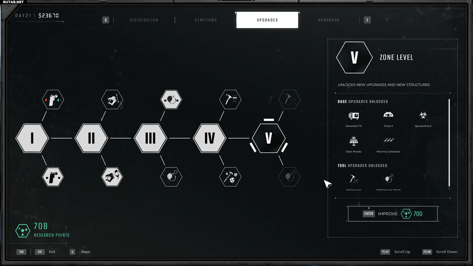В начале игры база игрока имеет Уровень Зоны I. Однако, накапливая очки исследований, можно повысить её уровень, что откроет доступ к новым улучшениям инструментов и модернизациям для базы выживших.