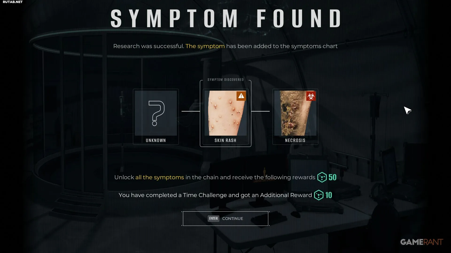 Если в ходе операции удастся обнаружить новый симптом, вы получите 10 RP. Если же будут найдены все симптомы в цепочке (то есть симптомы, которые эволюционируют во что-то более серьёзное), вы получите дополнительно 50 RP.