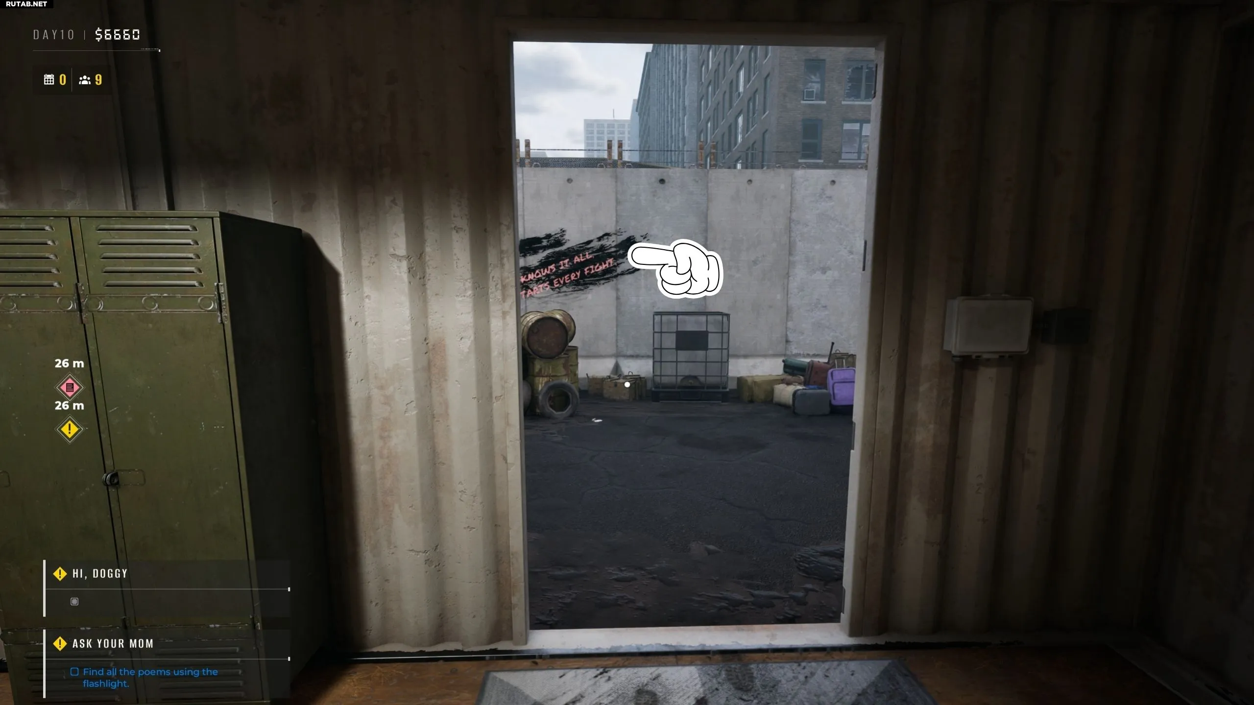 Выйдя утром из своих жилых помещений, вы сразу увидите первое граффити со стихом на стене прямо перед собой. Подойдите и взаимодействуйте с ним, чтобы начать поиск остальных стихов в лагере.