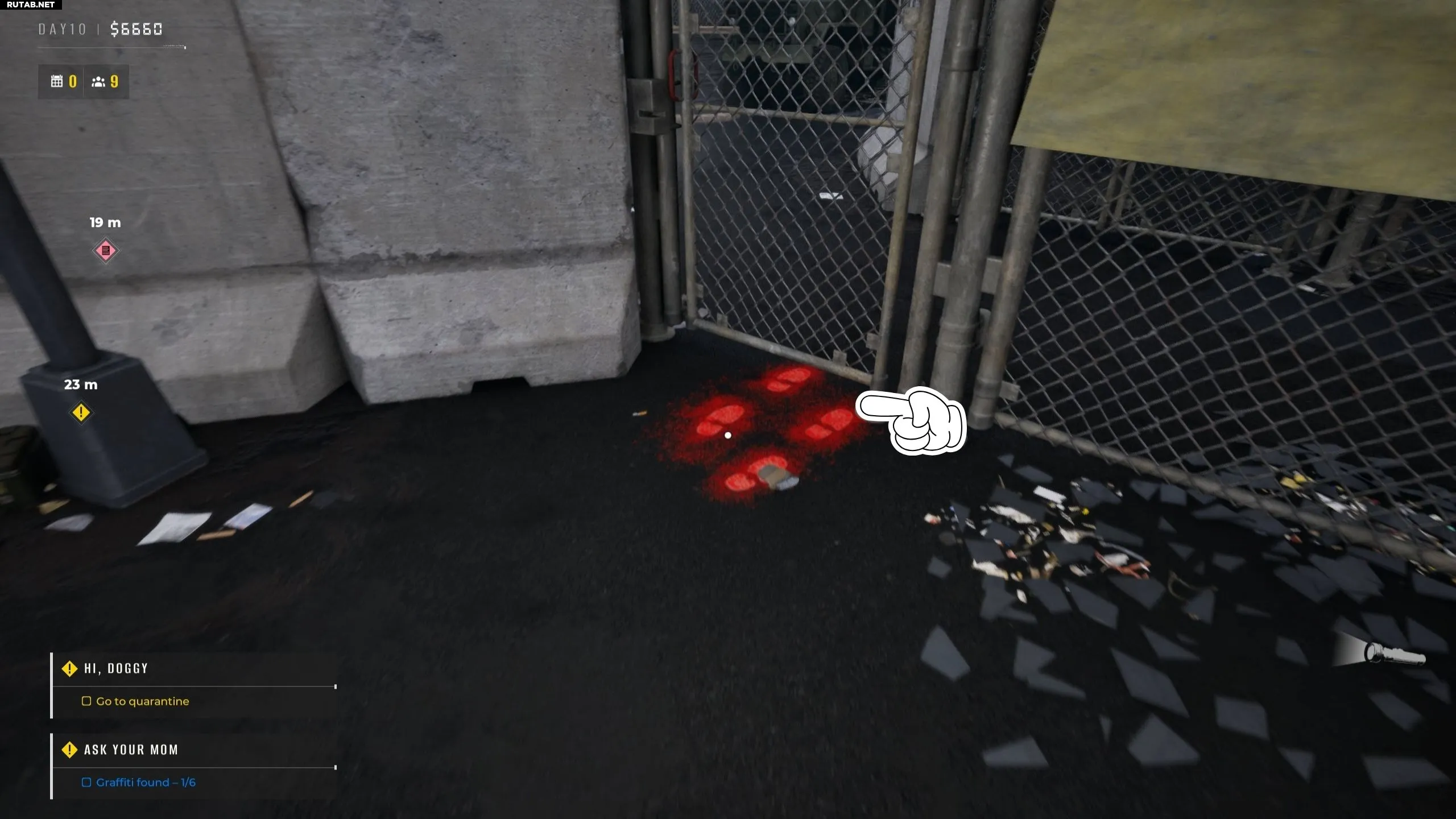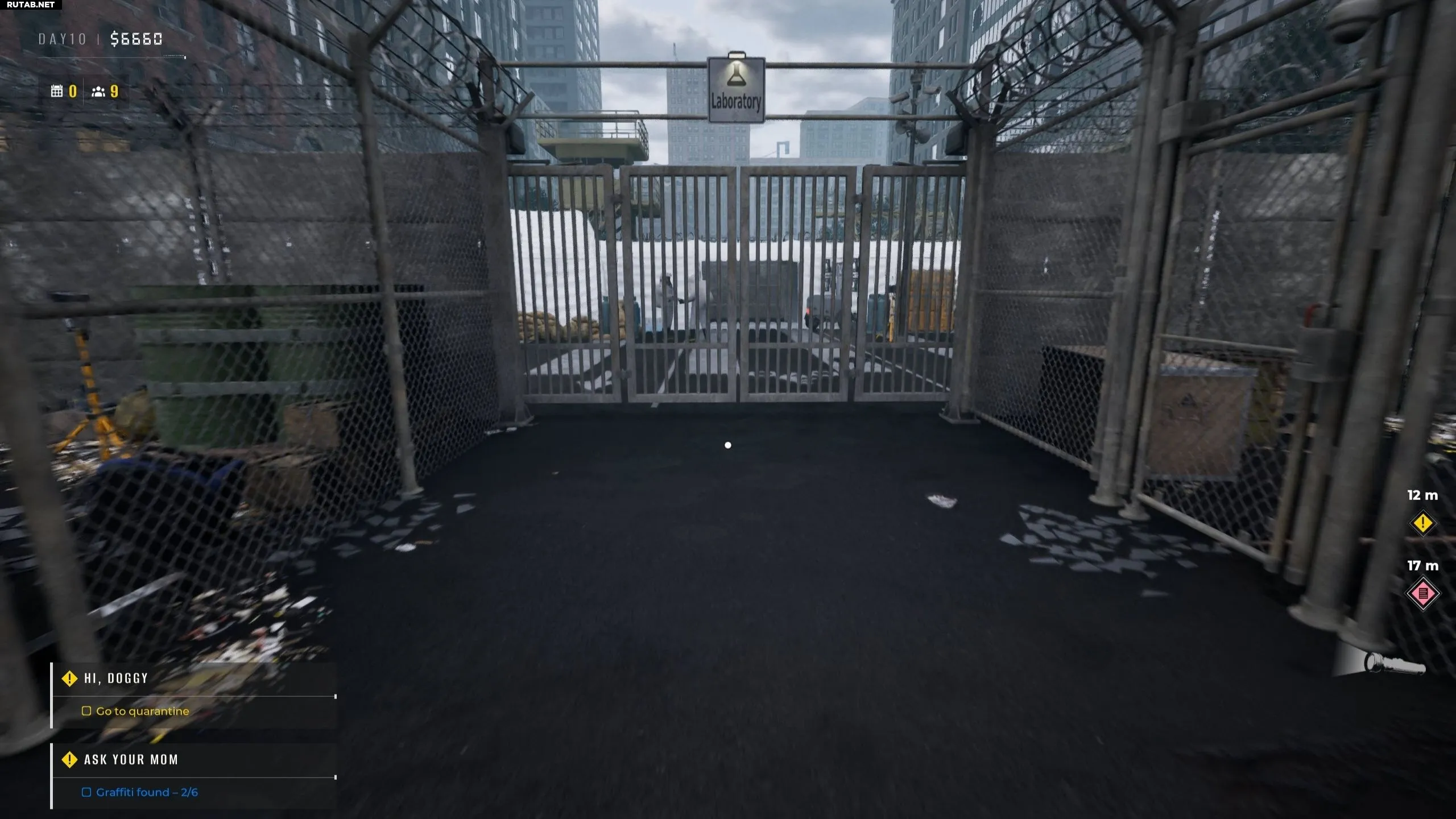 Теперь покиньте зону КПП и идите прямо, чтобы найти шестое и последнее граффити для квеста «Спроси у мамы». Оно находится на стене, где написано «Лаборатория».