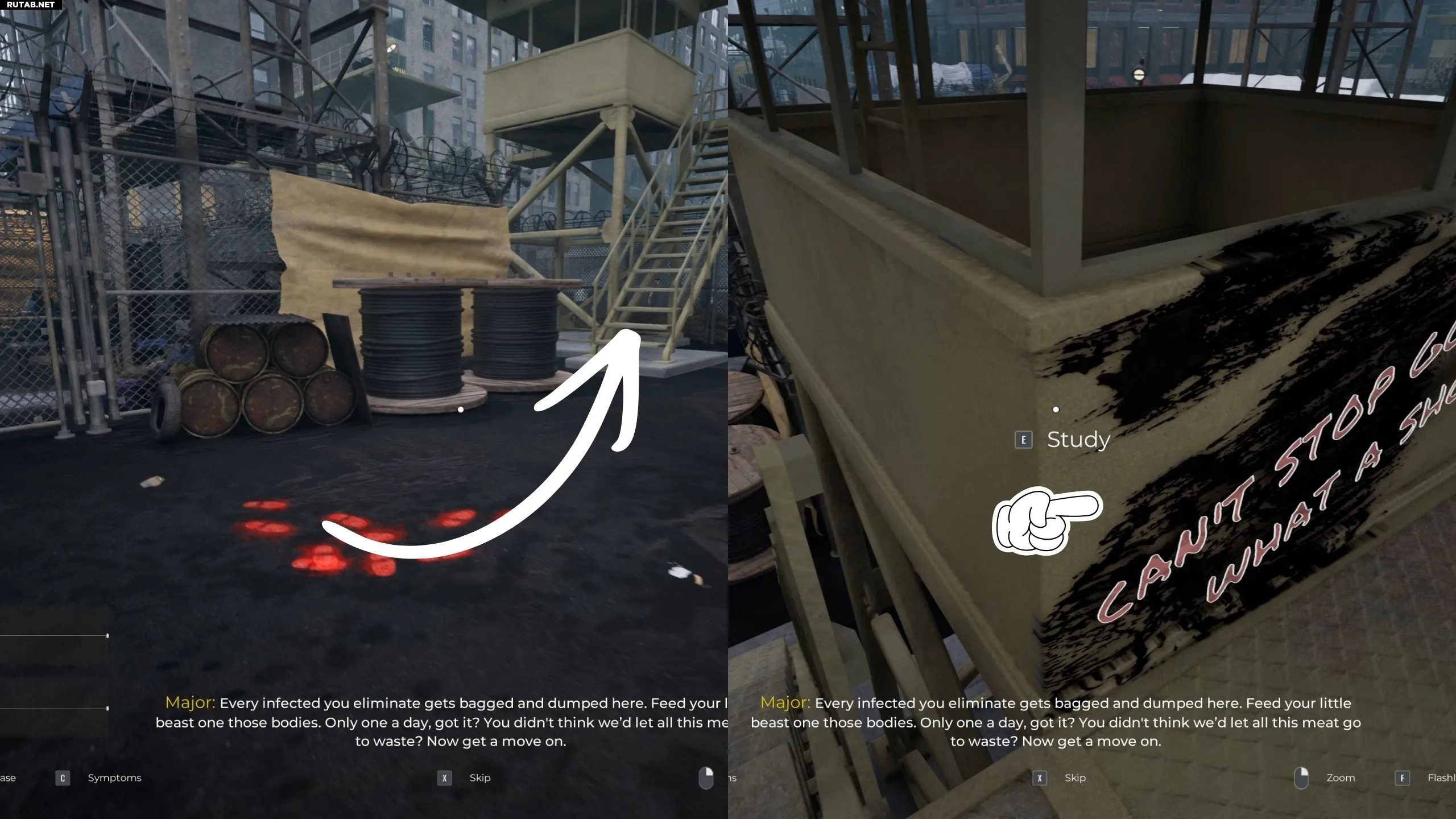 Выйдите из жилой зоны и поверните налево к КПП, где вы проверяете выживших на заражение. Оказавшись на КПП, поверните направо и поднимитесь на сторожевую вышку справа. Пятое граффити со стихом находится прямо наверху лестницы.