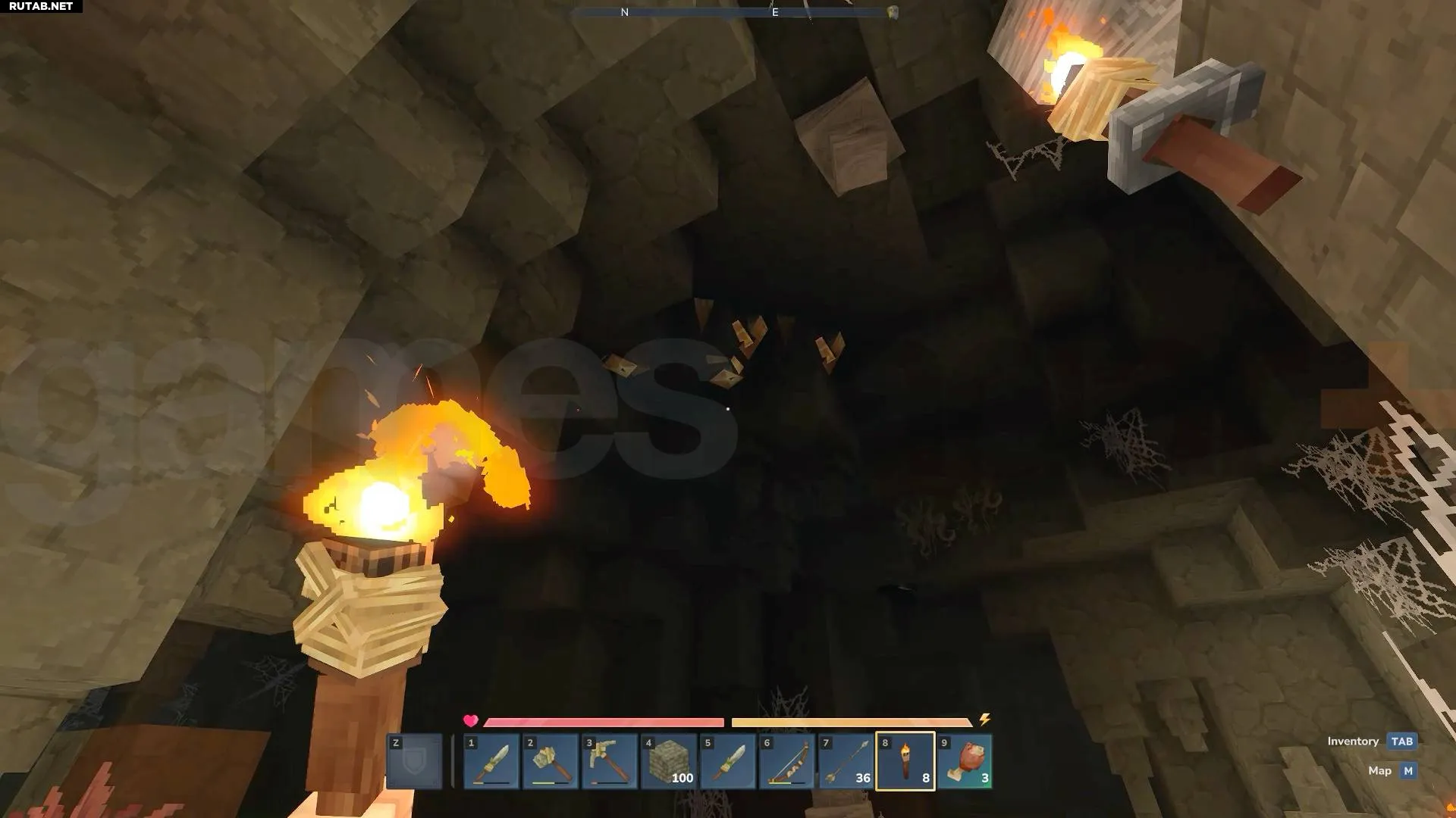 Оказавшись в пещере, будьте внимательны к двум вещам. Во-первых, к далёкому блеску руды, который вы увидите в стенах и потолке. А во-вторых, к паукам. Огромным паукам. Действительно большим паукам. Там есть и другие монстры, но чаще всего я встречал именно пауков, чьё присутствие выдаёт обилие паутины вокруг.