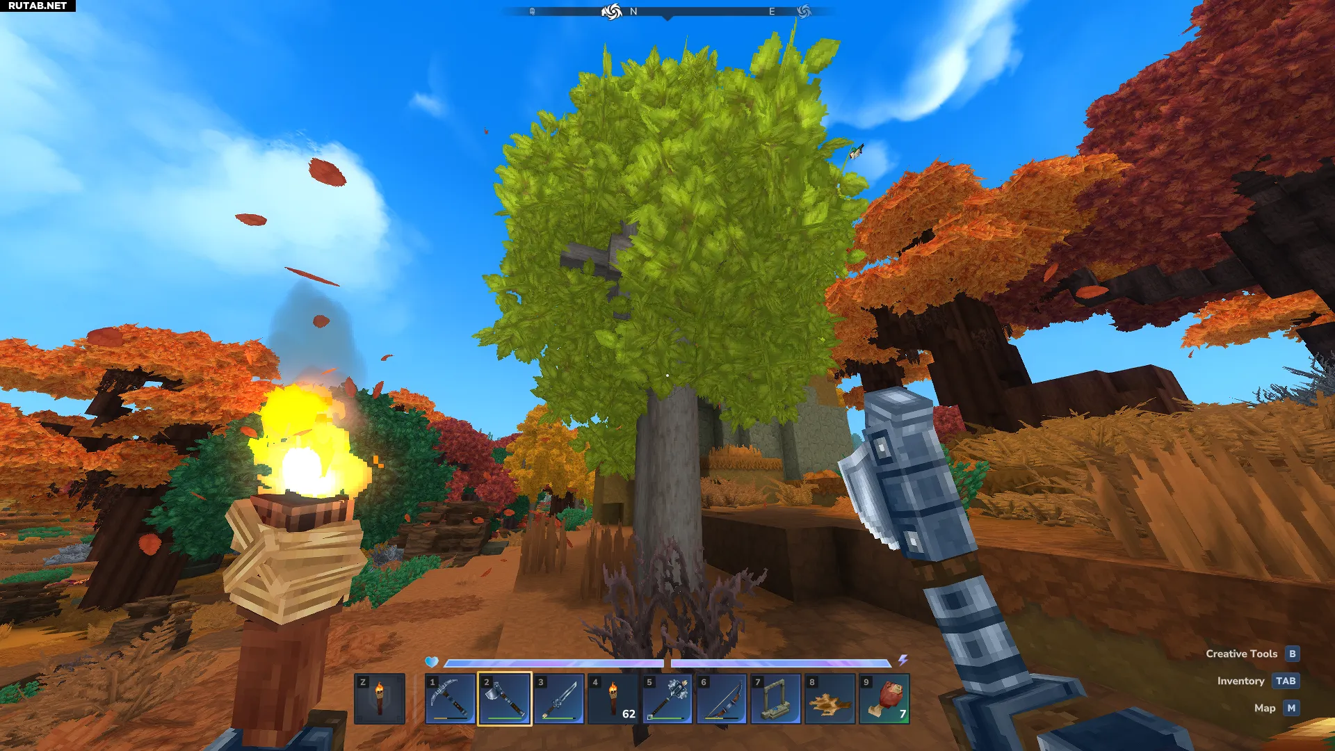 Первый и самый распространённый тип светлого дерева — это берёза. Её можно найти в осенних биомах, расположенных рядом с обычными зелёными лугами. На карте эти зоны выделяются красными лесами. Осенние биомы по уровню опасности схожи с обычными лесами, поэтому для их исследования не требуется особая экипировка.