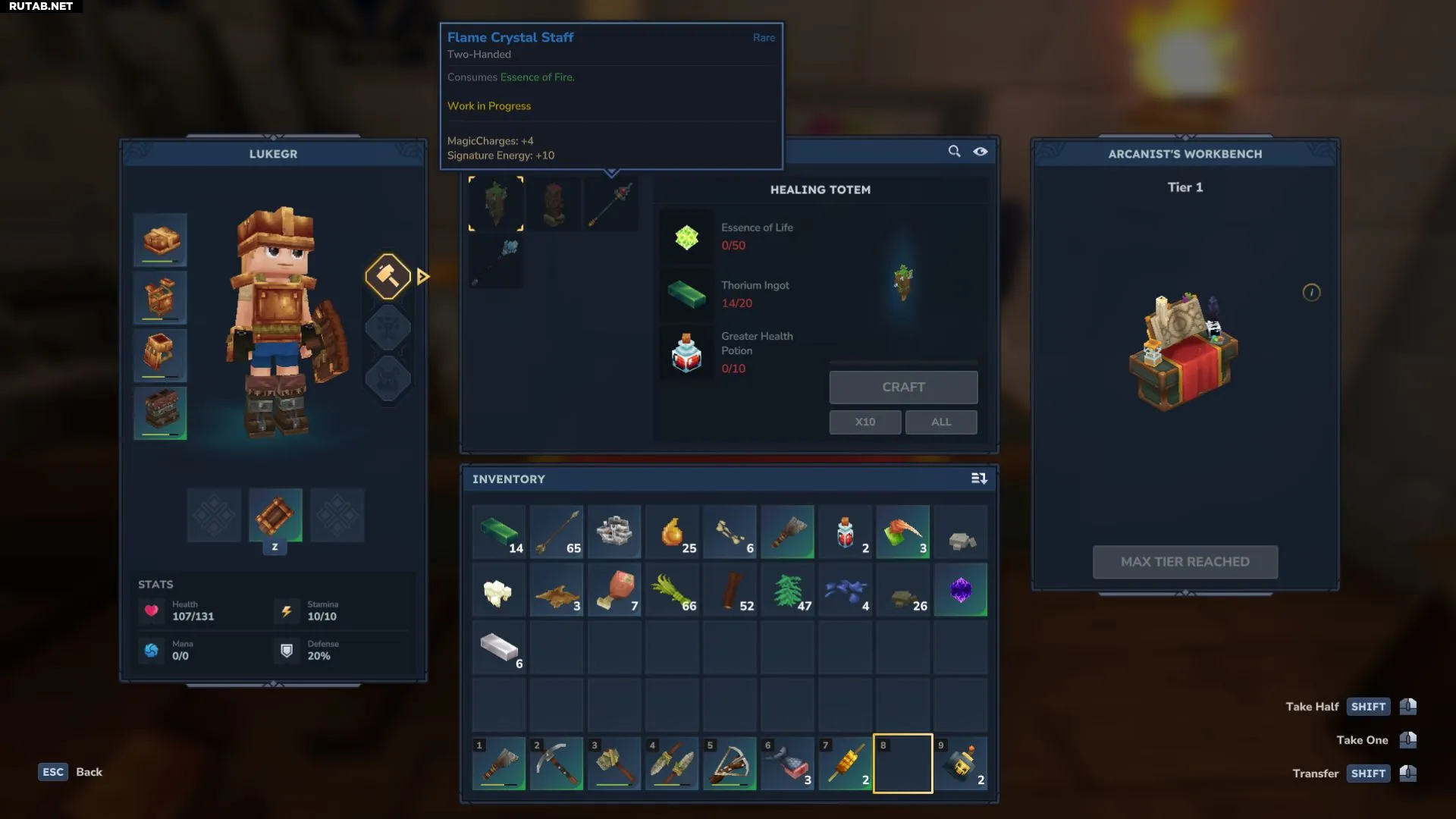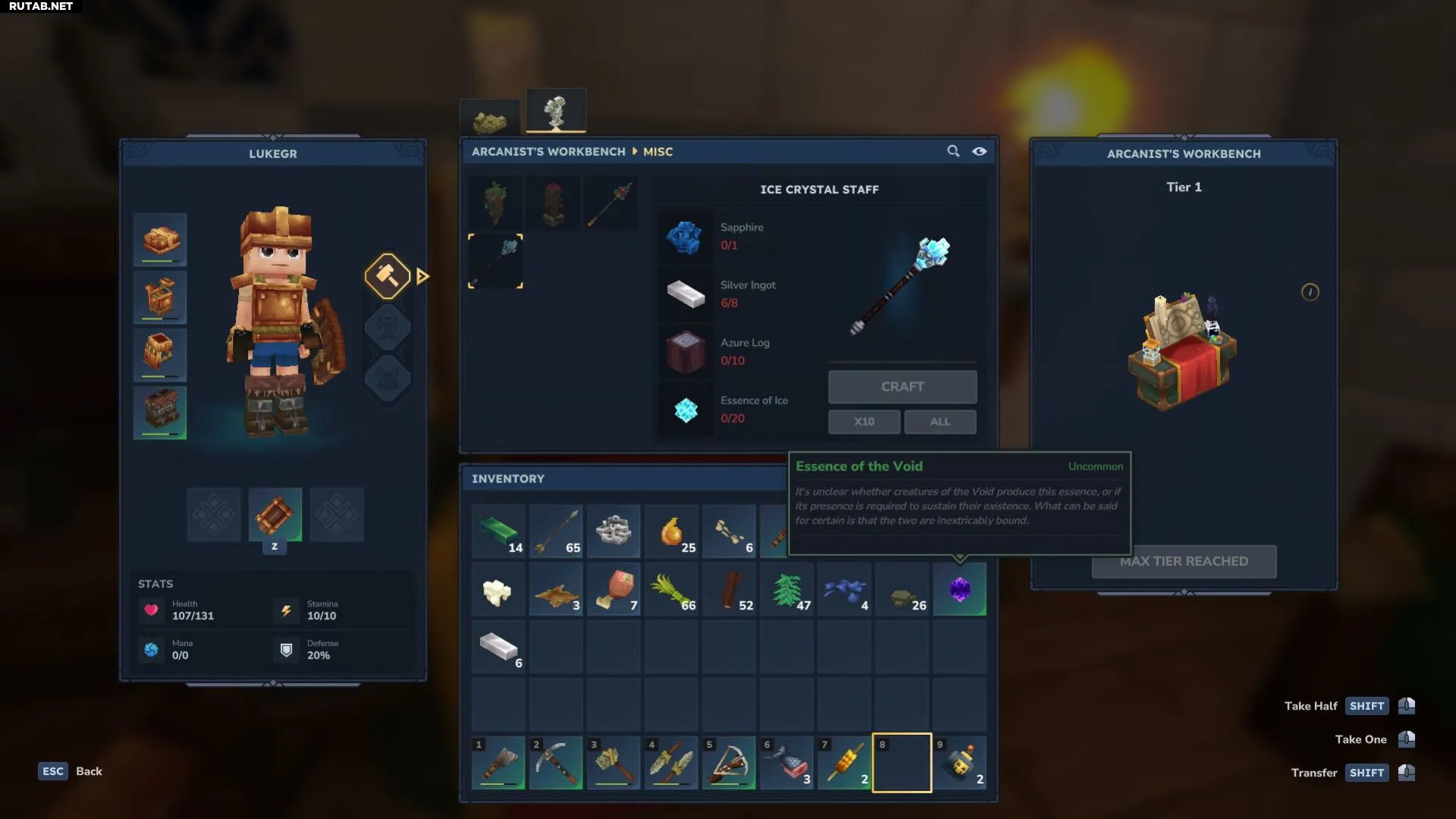 Для создания Верстака арканиста на обычном верстаке потребуется: 30 льняных тканей, 30 слитков тория и 20 сущностей пустоты (их можно добыть, побеждая врагов ночью).