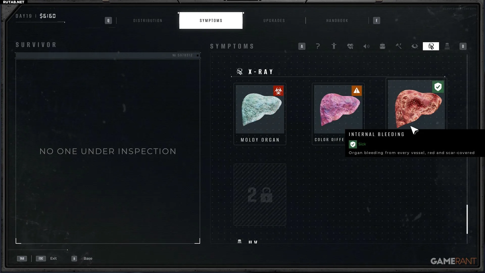 Изначально игроку известен только симптом «Внутреннее кровотечение». Новые симптомы можно обнаружить и подтвердить в Лаборатории, чтобы добавить их в справочник.