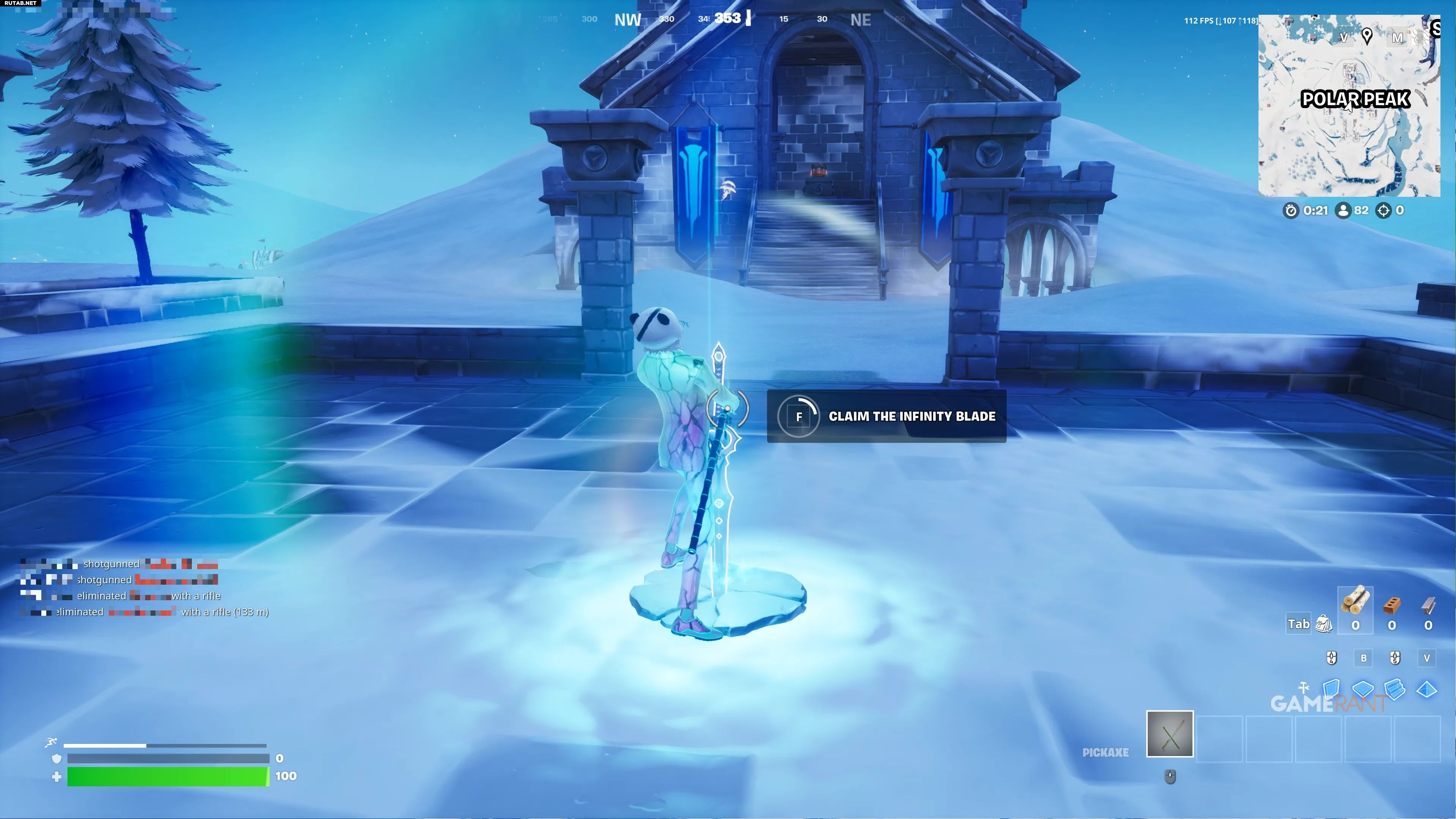 Клинок Бесконечности — это возвращающееся мифическое оружие. Чтобы получить его, вам нужно приземлиться в локации Полярная вершина (Polar Peak). Сам клинок находится в самом центре этой локации. Чтобы подобрать его, просто удерживайте кнопку взаимодействия, когда окажетесь рядом. Учтите, что в одном матче его может взять только один игрок.