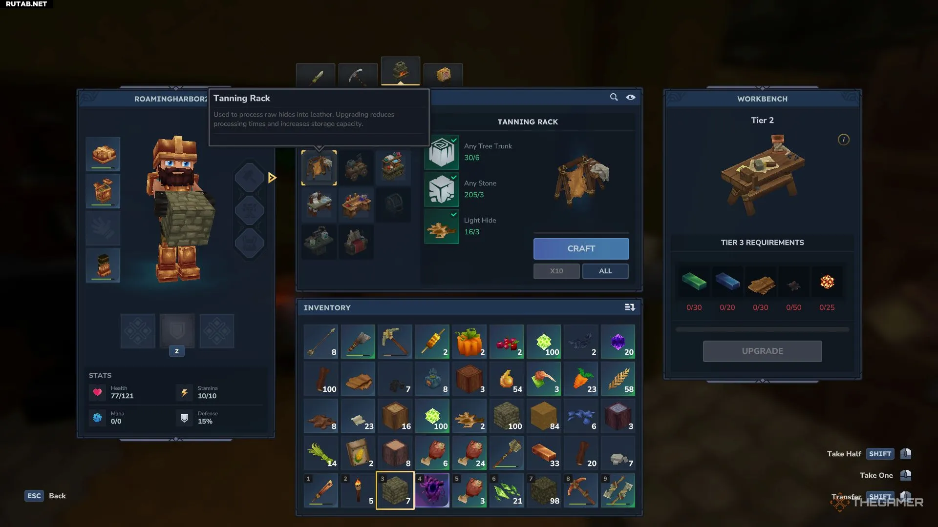 Для обработки шкур вам понадобится дубильная стойка. Создайте её на верстаке, используя следующие ресурсы: