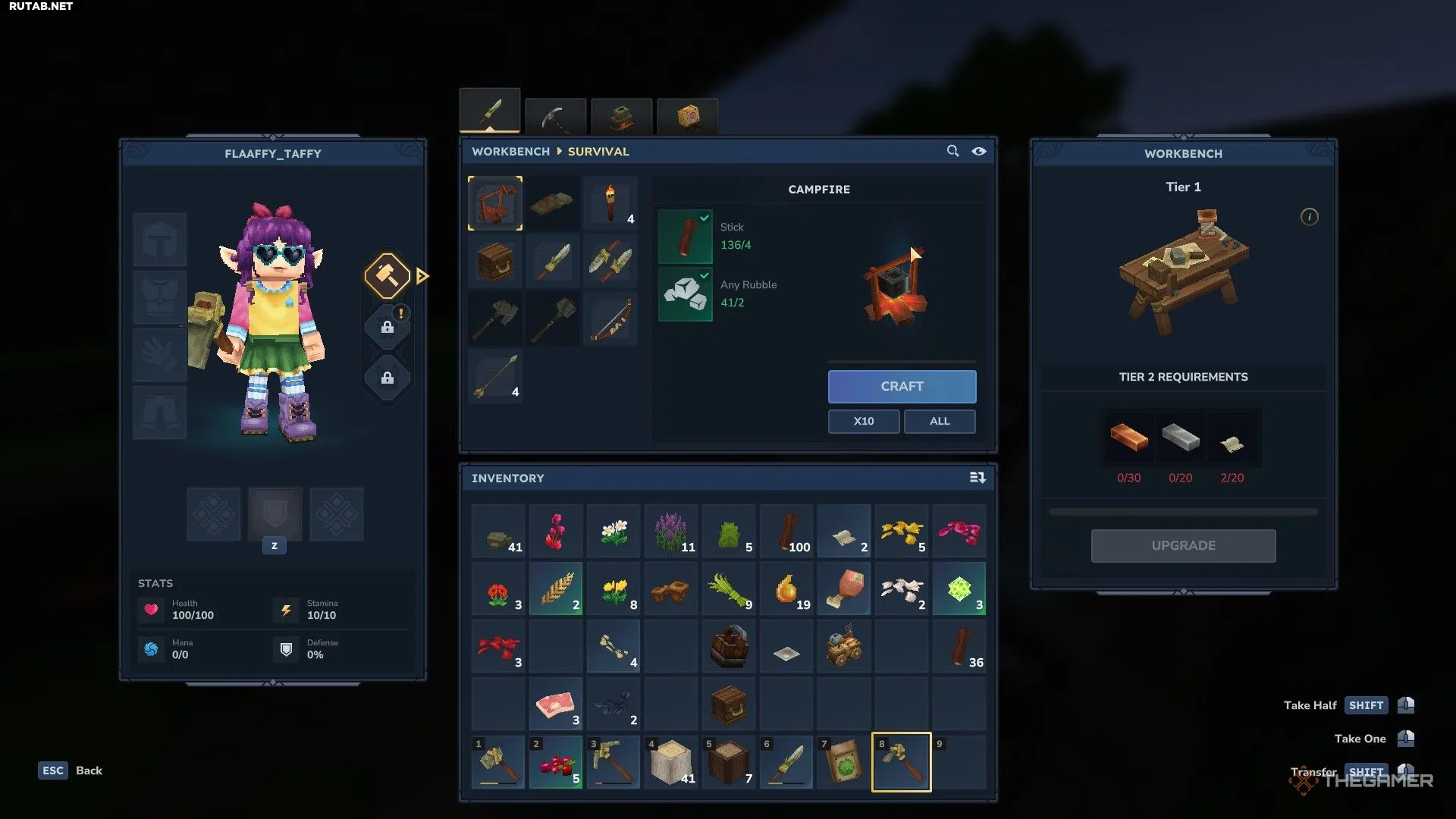 Во вкладке «Инструменты» на верстаке вы найдёте рецепты для создания и улучшения ваших основных орудий труда. Они разделены на уровни (тиры), и для доступа к более продвинутым инструментам потребуется улучшить верстак и добыть соответствующие материалы.