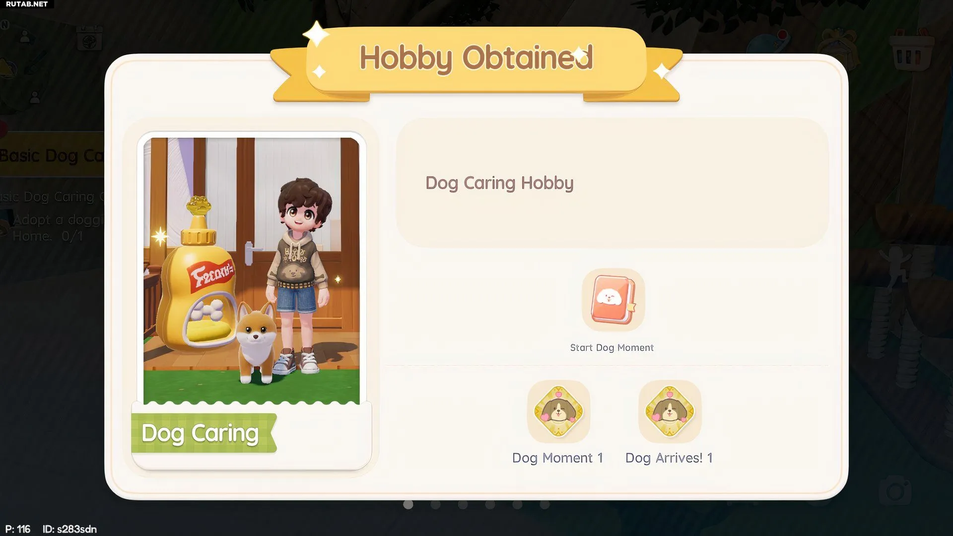 Перед тем как заботиться о животных, необходимо сначала открыть пять основных хобби: Кулинария, Садоводство, Ловля насекомых, Наблюдение за птицами и Рыбалка. Затем посетите Приют. Миссис Джоан попросит у вас Билет на расширение хобби. Передав его, вы сначала откроете хобби «Уход за кошками», а вскоре после него — «Уход за собаками». Билетов хватит на оба.