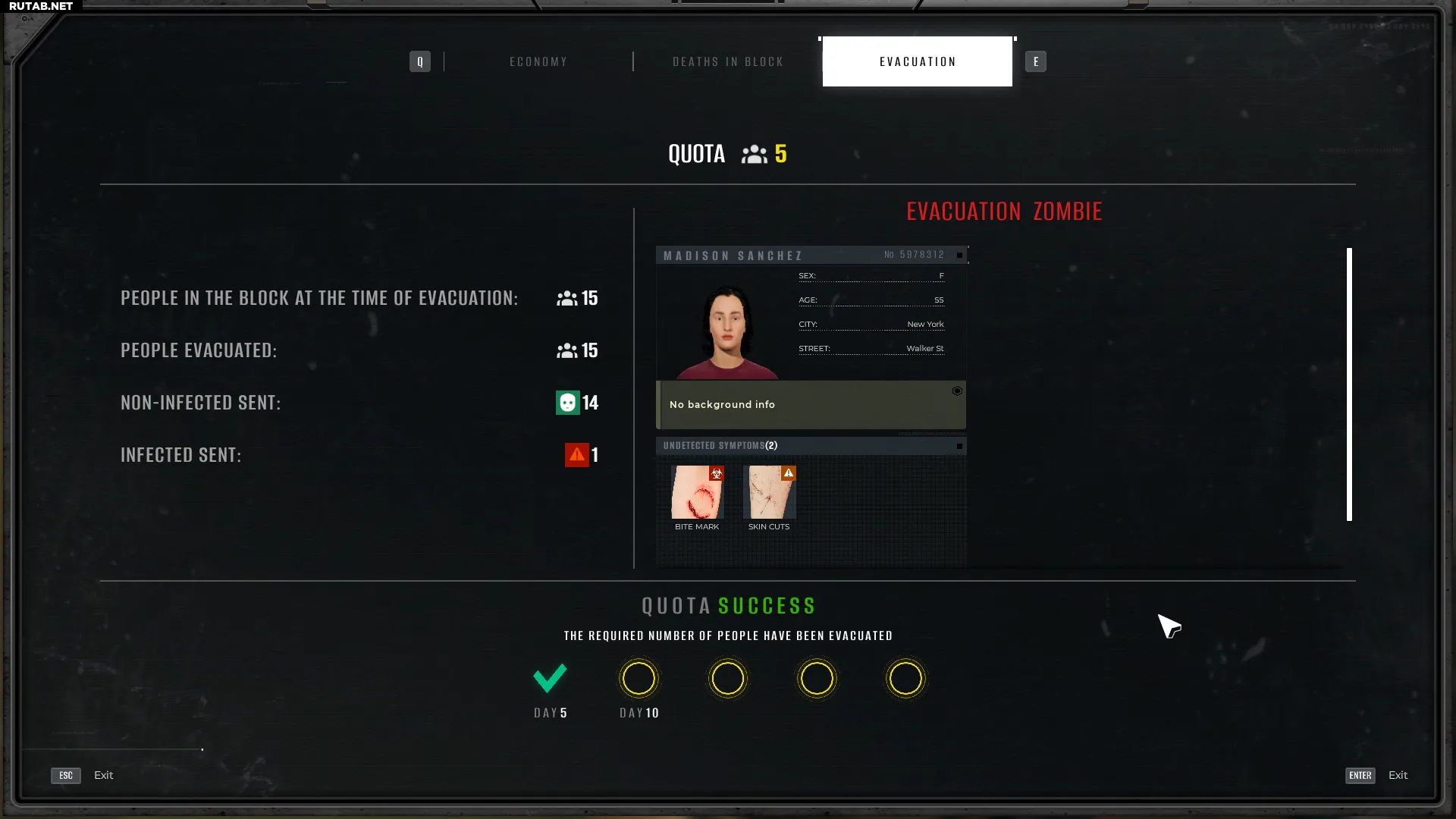 Когда выживший проходит через КПП в Карантинной зоне: Последняя проверка, игрок должен проанализировать его состояние, чтобы понять, достаточно ли оно хорошее для допуска в лагерь до эвакуации. Однако это не всегда так, и часто приходится решать, что делать с выжившими, чьё состояние плохое или вызывает сомнения.