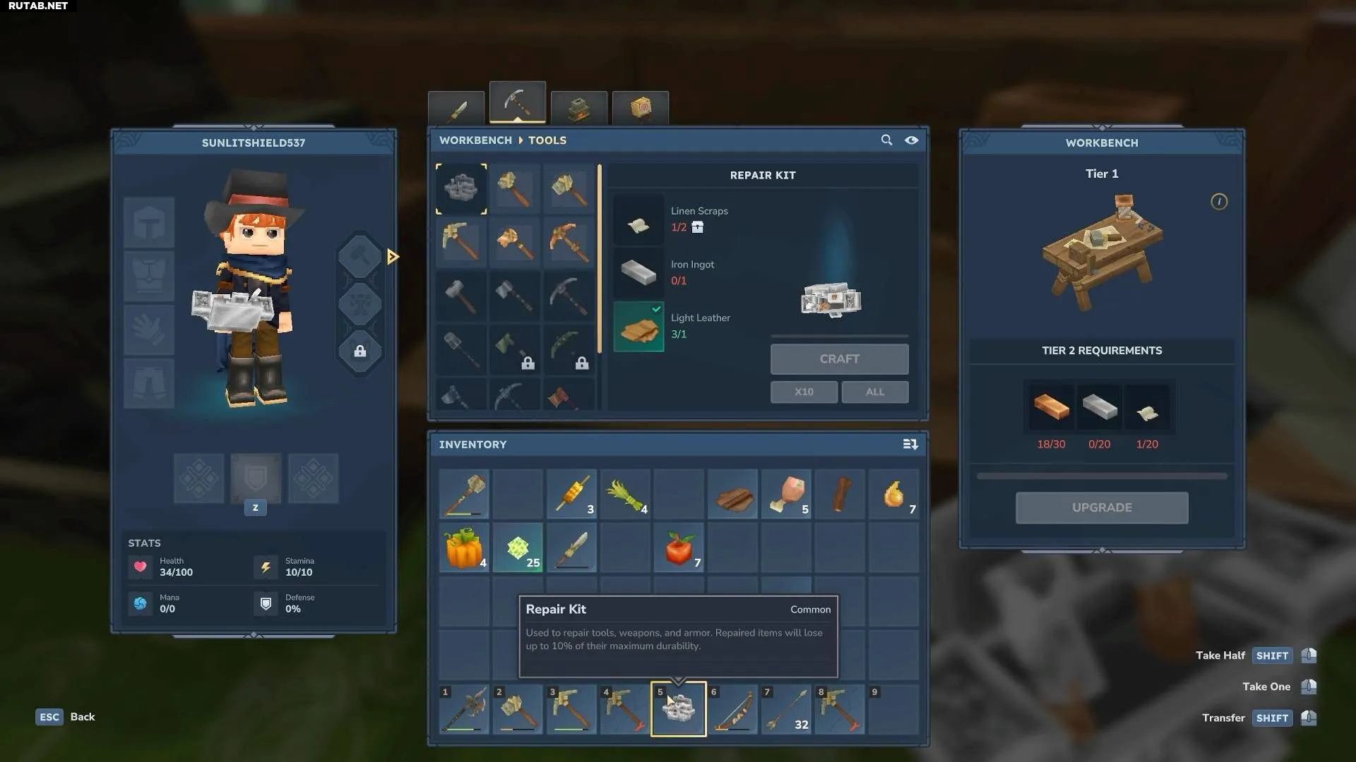 Опция для создания ремонтного набора находится в разделе инструментов на вашем верстаке, там же, где вы крафтите топоры и кирки. Это предмет в верхнем левом углу, похожий на серебристый слиток.