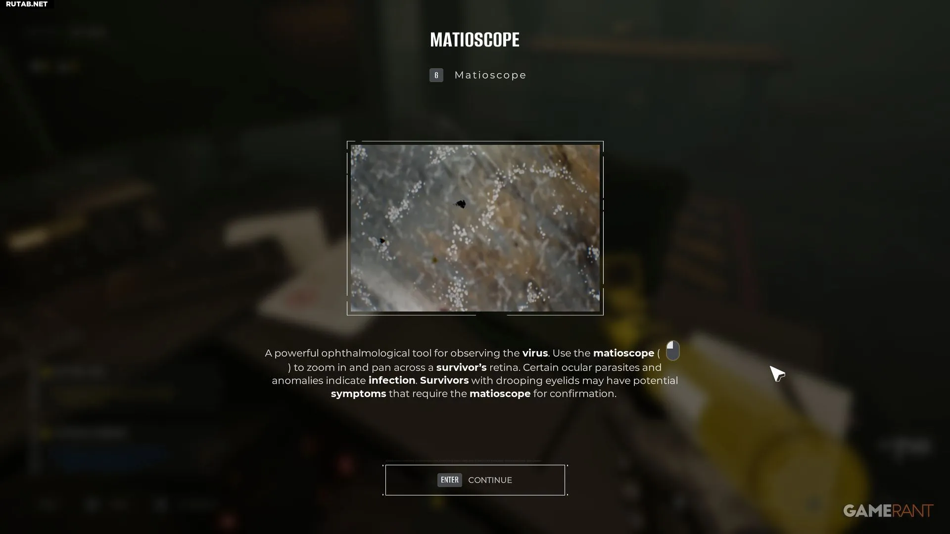 Чтобы использовать Матиоскоп, наведите его на глаз пациента и нажмите (ЛКМ/RT/R2). Затем сфокусируйте изображение, прокручивая колесико мыши вперед или удерживая (LT/L2). Это даст четкую картинку для поиска паразитов.
