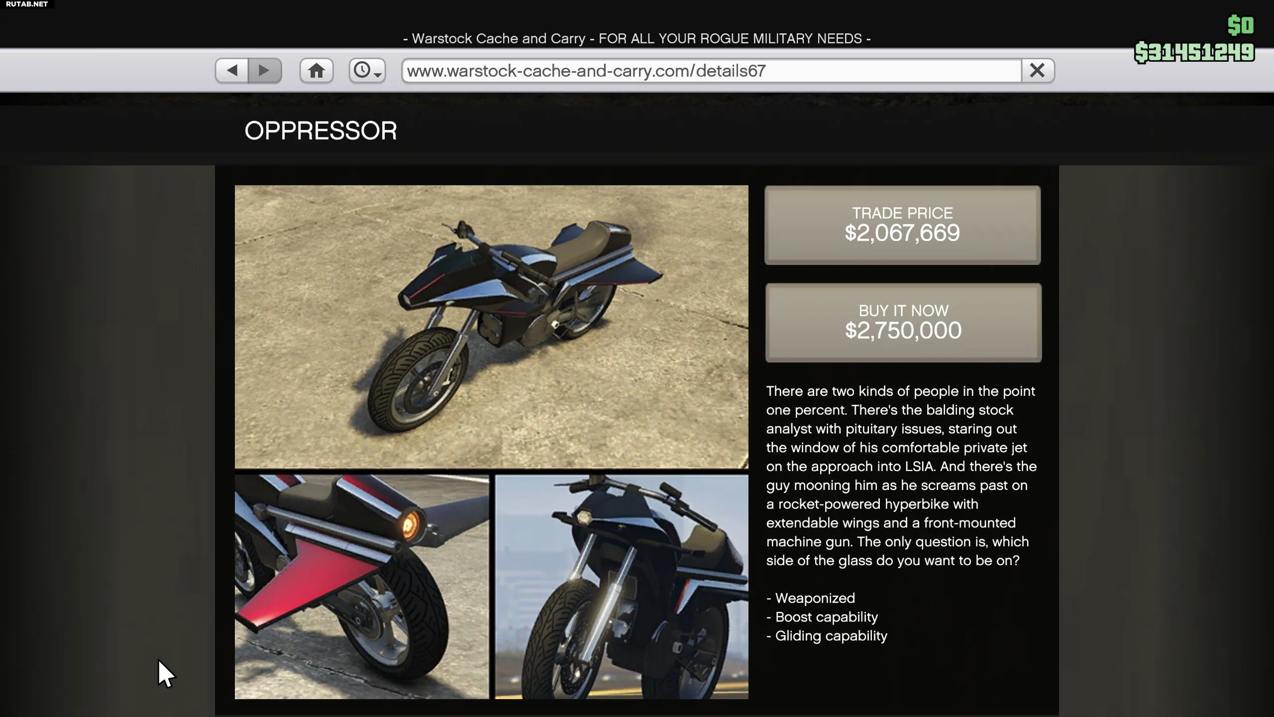 Oppressor оснащён ракетным ускорителем для большей скорости, а поднятие носа активирует крылья для планирования, позволяя вам «падать со стилем». Дальнейшие улучшения, исследуемые в MOC и Бункере, добавляют ракеты и пулемёты, что даёт огневую мощь даже транспортному средству, созданному исключительно для удовольствия.