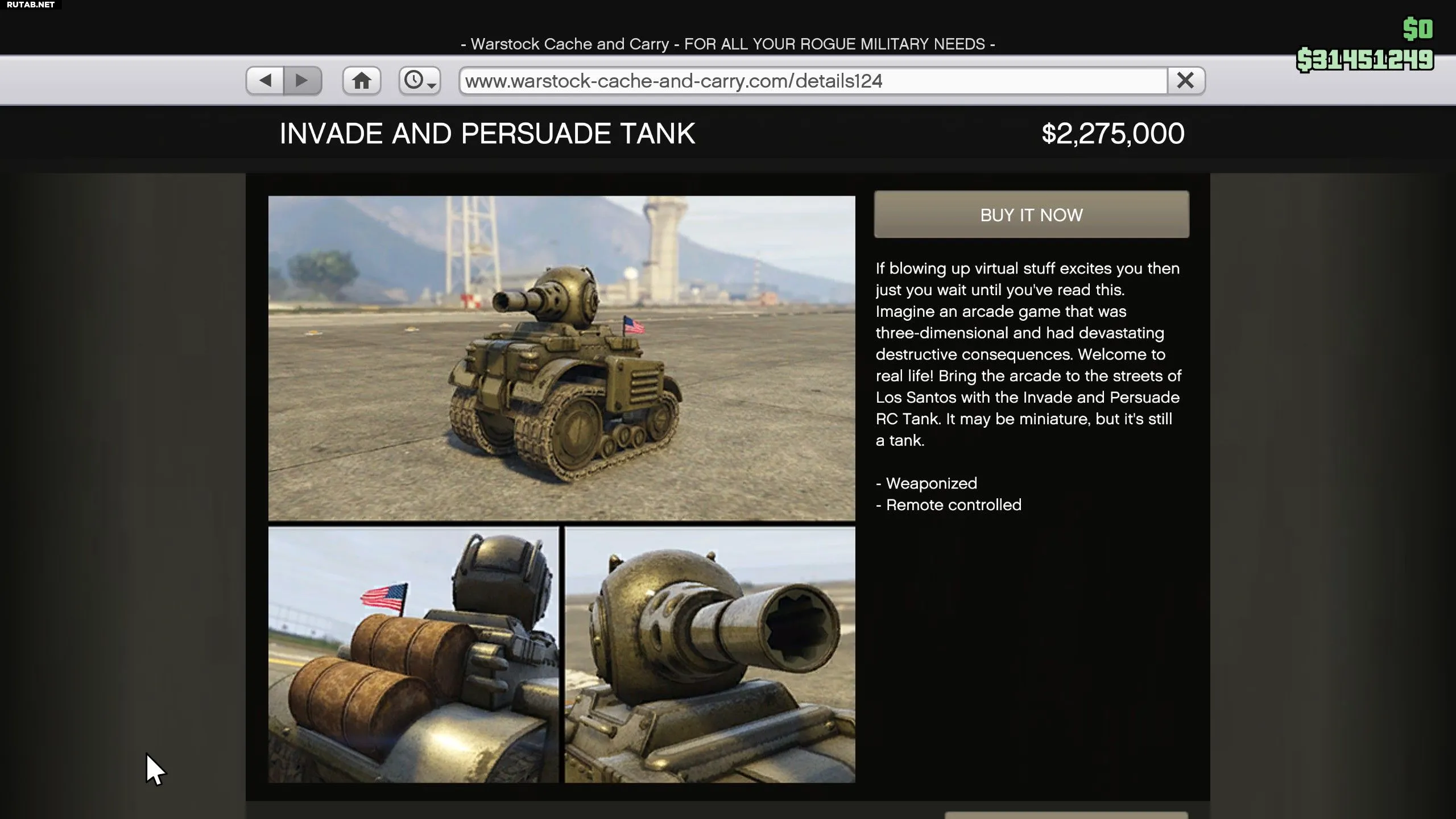 Invade and Persuade Tank — это миниатюрная радиоуправляемая машина, позволяющая вам в полной безопасности кататься на крошечном танке по улицам Лос-Сантоса. Активируется он через интерактивное меню, и как только вы внутри, ваш персонаж исчезает, позволяя убивать без угрызений совести и без риска, что другой игрок вас устранит.