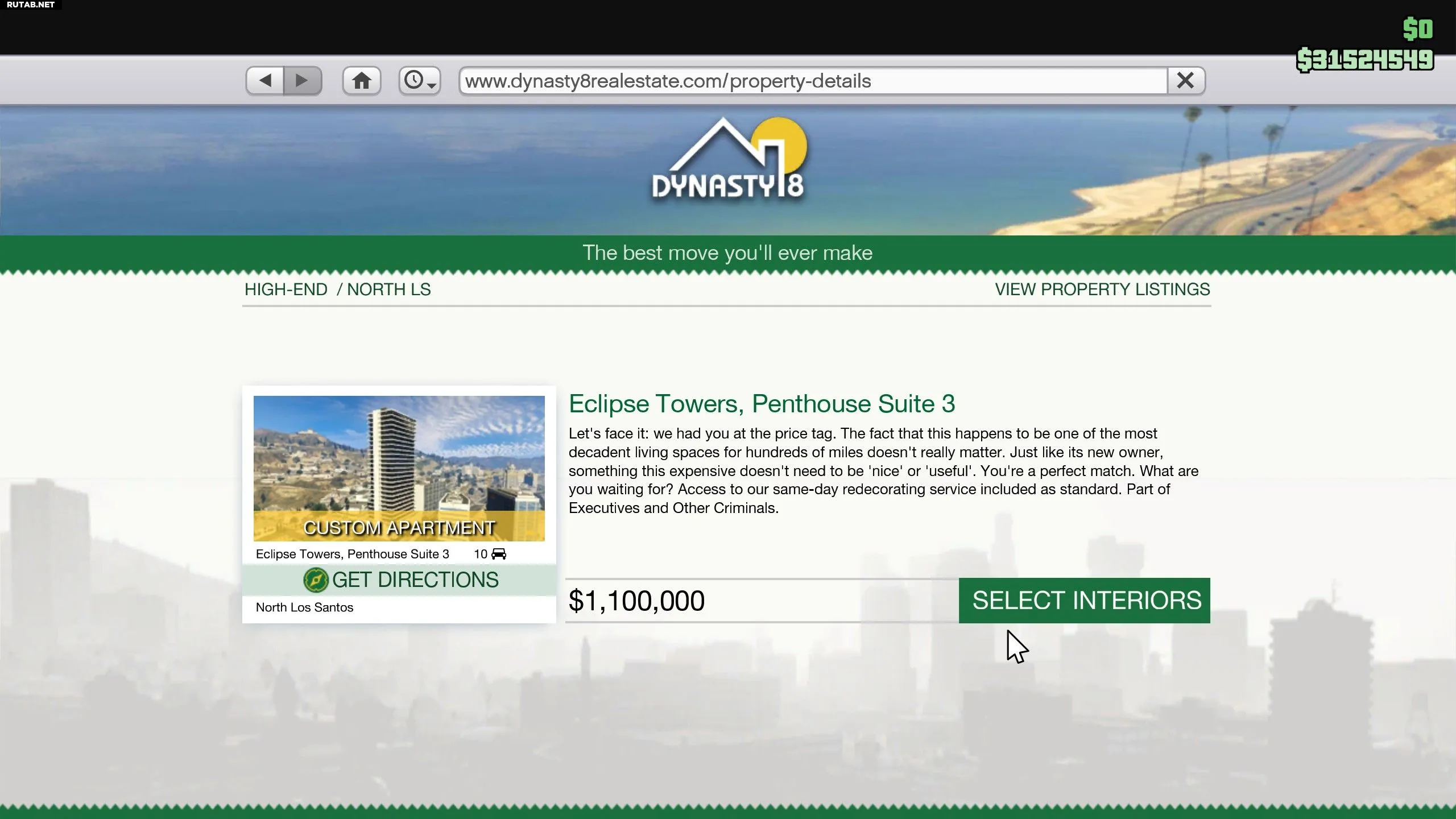 Пентхаусы в Eclipse Towers можно использовать для запуска оригинальных ограблений, но это не делает их хорошей покупкой, поскольку те же функции есть и у более дешёвых апартаментов высокого класса. Даже гараж на 10 машин не является преимуществом — он тоже есть у других дорогих квартир. Если вы ищете хороший дом с бонусами, рассмотрите особняки: они предоставляют доступ к Главному контрольному терминалу для управления бизнесом и возможность ускорить производство одного из предприятий раз в 24 часа.