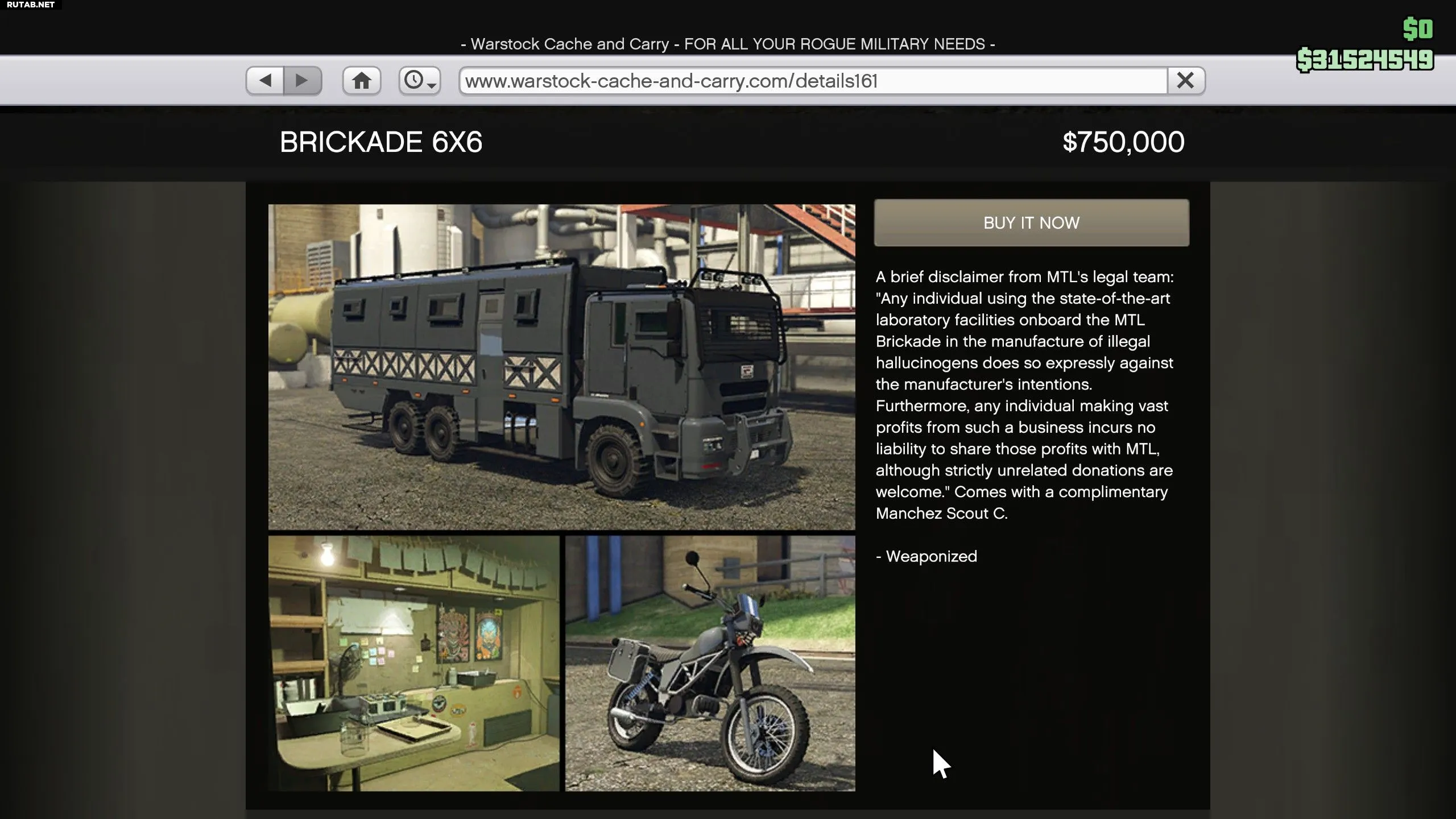 Покупка Brickade 6x6 — это полная трата денег, так как вам ещё придётся заплатить за настройку Кислотной лаборатории, а затем и за её улучшения. В итоге вы потратите более $1 750 000, чтобы получать прибыль всего в $320 000 каждые 4 часа. Кислотная лаборатория — отличное предприятие, но приобретать её стоит только бесплатно через миссии Дакса, а не покупать Brickade на сайте Warstock.