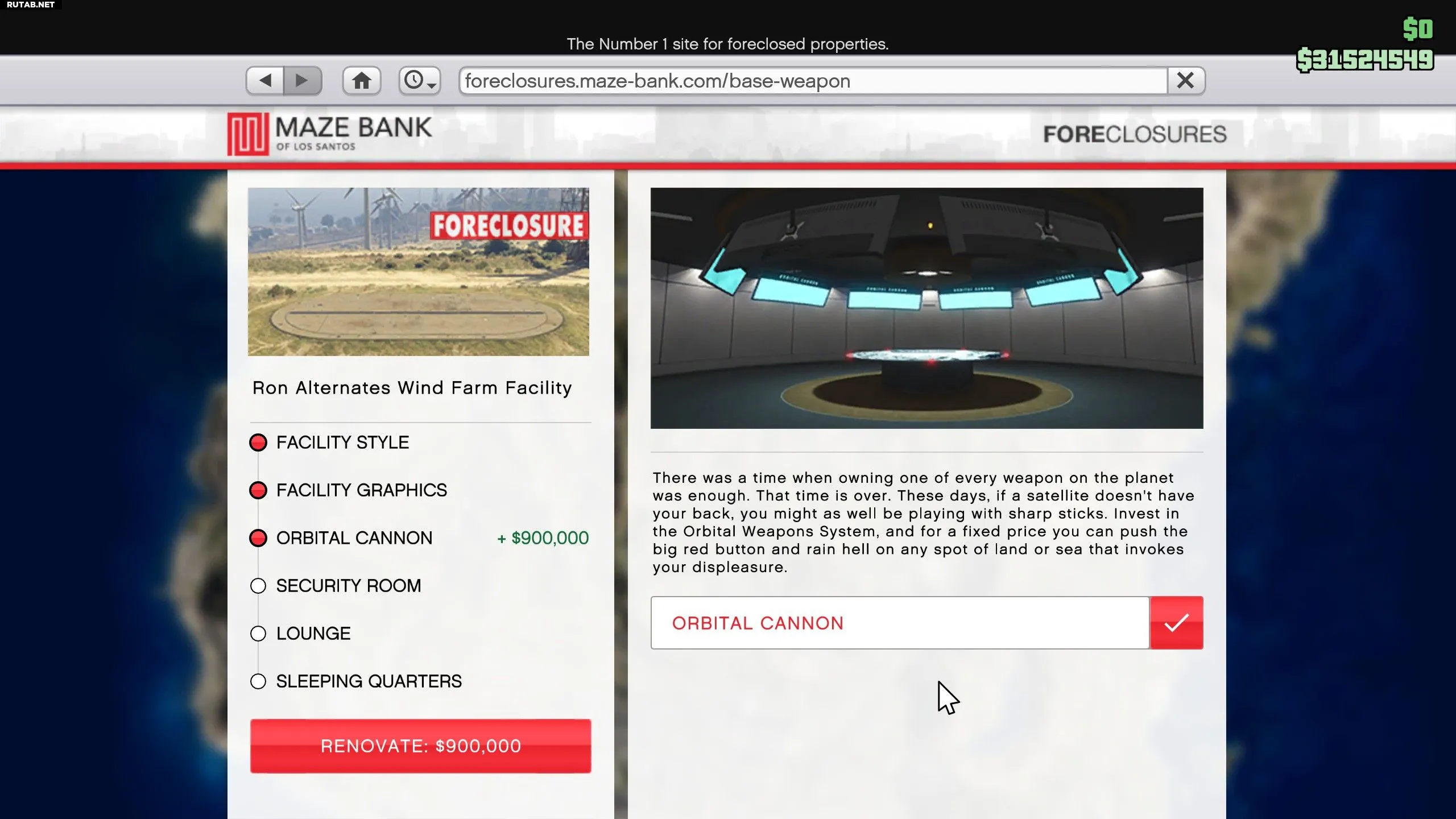 Орбитальную пушку можно приобрести за $900 000, если у вас есть объект. Хотя сам объект — неплохое вложение, учитывая деньги, которые вы заработаете при первом прохождении актов 1–3 ограбления «Судный день», орбитальная пушка — это полная трата средств, так как она используется только для троллинга других игроков по невероятно высокой цене.