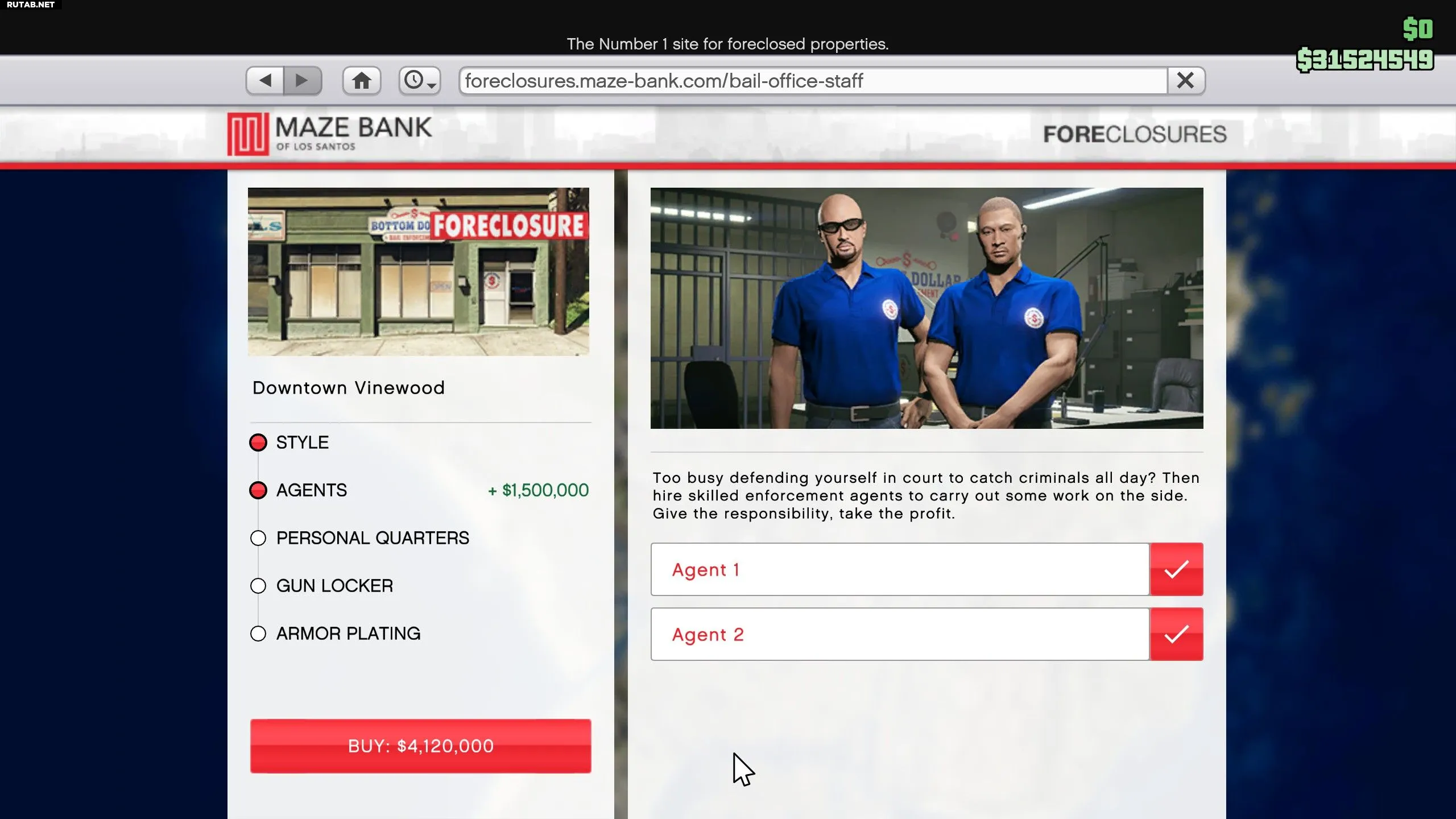 Контору по внесению залога можно приобрести на сайте Maze Bank Foreclosures, причём цены на разные локации варьируются от $1 650 000 до $2 620 000. Владея этой конторой, игроки получают доступ к довольно забавной деятельности: они выбирают цель в своём офисе, а затем отправляются по всему Сан-Андреасу, чтобы найти и задержать её (желательно живой) за вознаграждение. К сожалению, прибыль не так велика, и вам придётся потратить часы, если не дни, на охоту за целями, чтобы попытаться вернуть свои деньги.