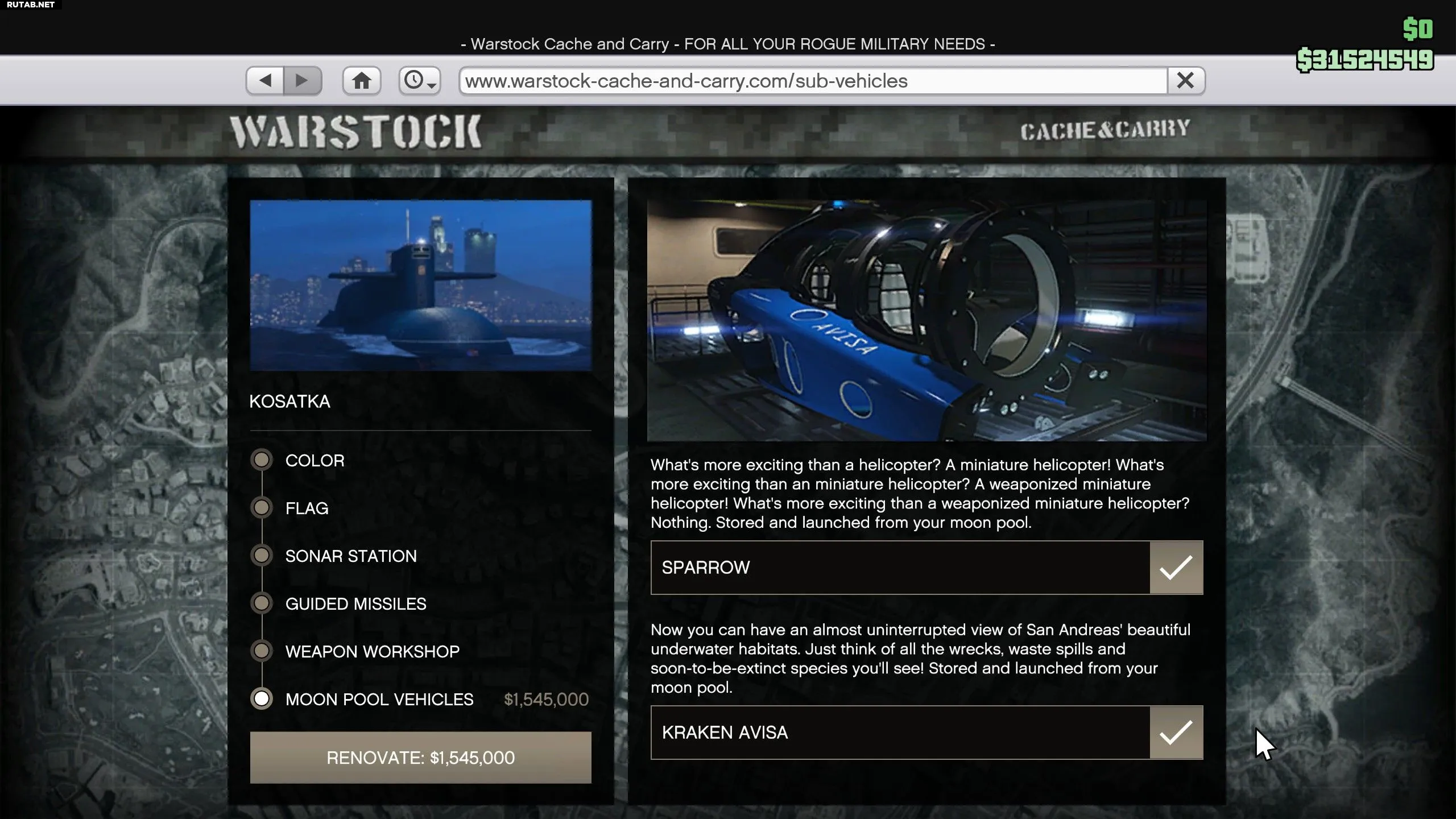 Эти деньги лучше потратить на Sparrow для участия «Косатки» в ограблении Кайо-Перико, а Kraken Avisa — это полная трата средств. Он не только медленнее стандартного Kraken (который бесплатен для вернувшихся игроков на сайте DockTease), но и значительно дороже. В ограблении Кайо-Перико, для которого нужна «Косатка», нет подводных миссий, где бы требовался Kraken Avisa, так что вы просто выбросите почти $2 000 000 на ветер.