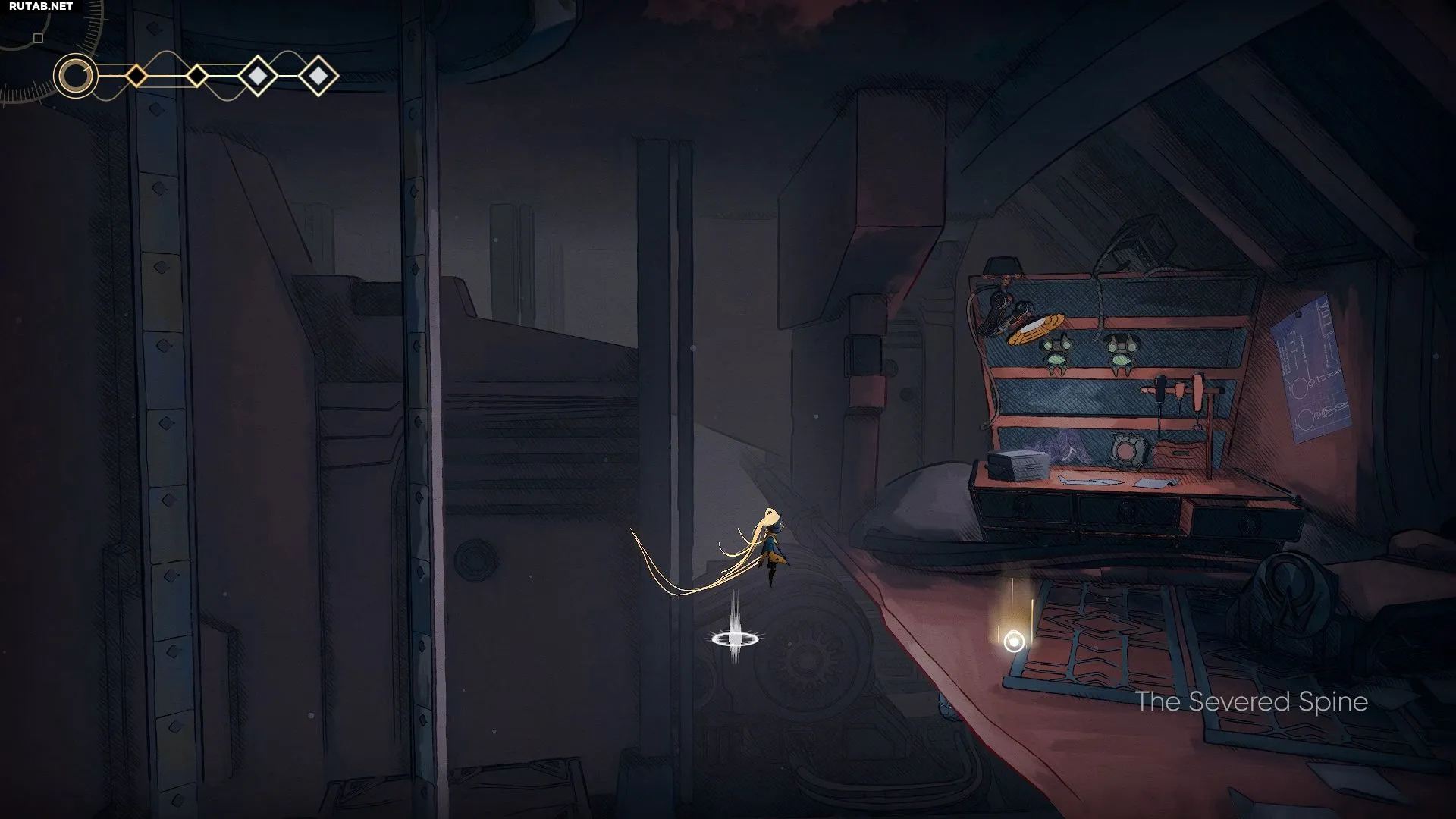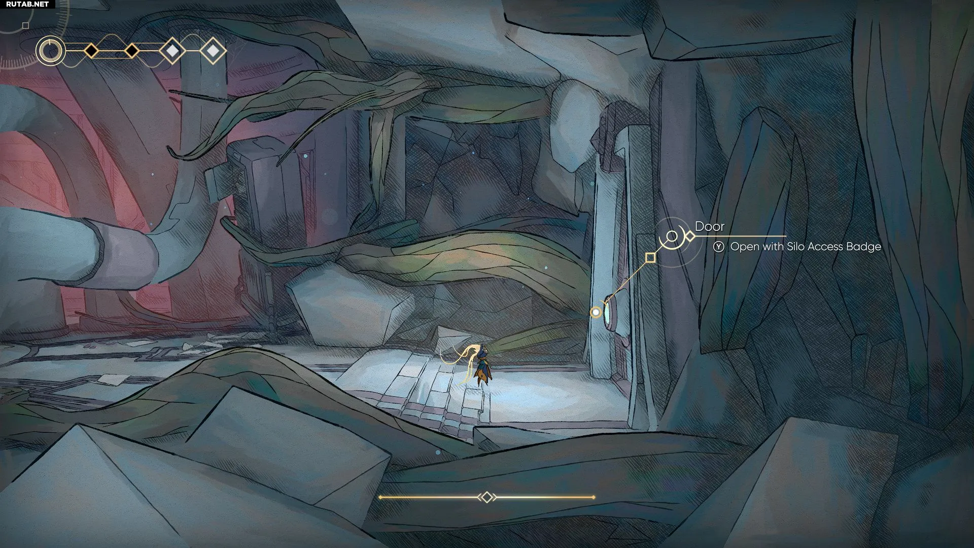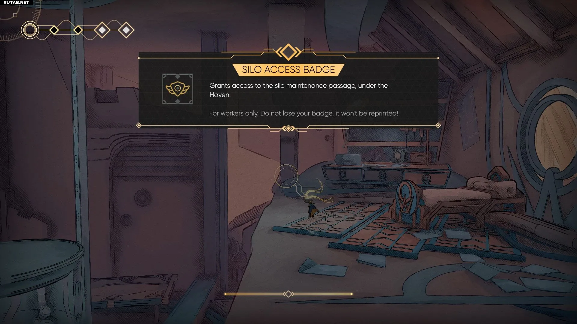 После получения навыка «Шпилька» отправляйтесь к роботу Шии. Слева от него, перед дверью в магазин Мэл и к лифту, вы увидите парящий зеленый кристалл. Зацепитесь за него, чтобы подняться вверх, и запрыгните в окно. На полу внутри комнаты лежит неизвестный предмет — это и есть Значок доступа к силосу.