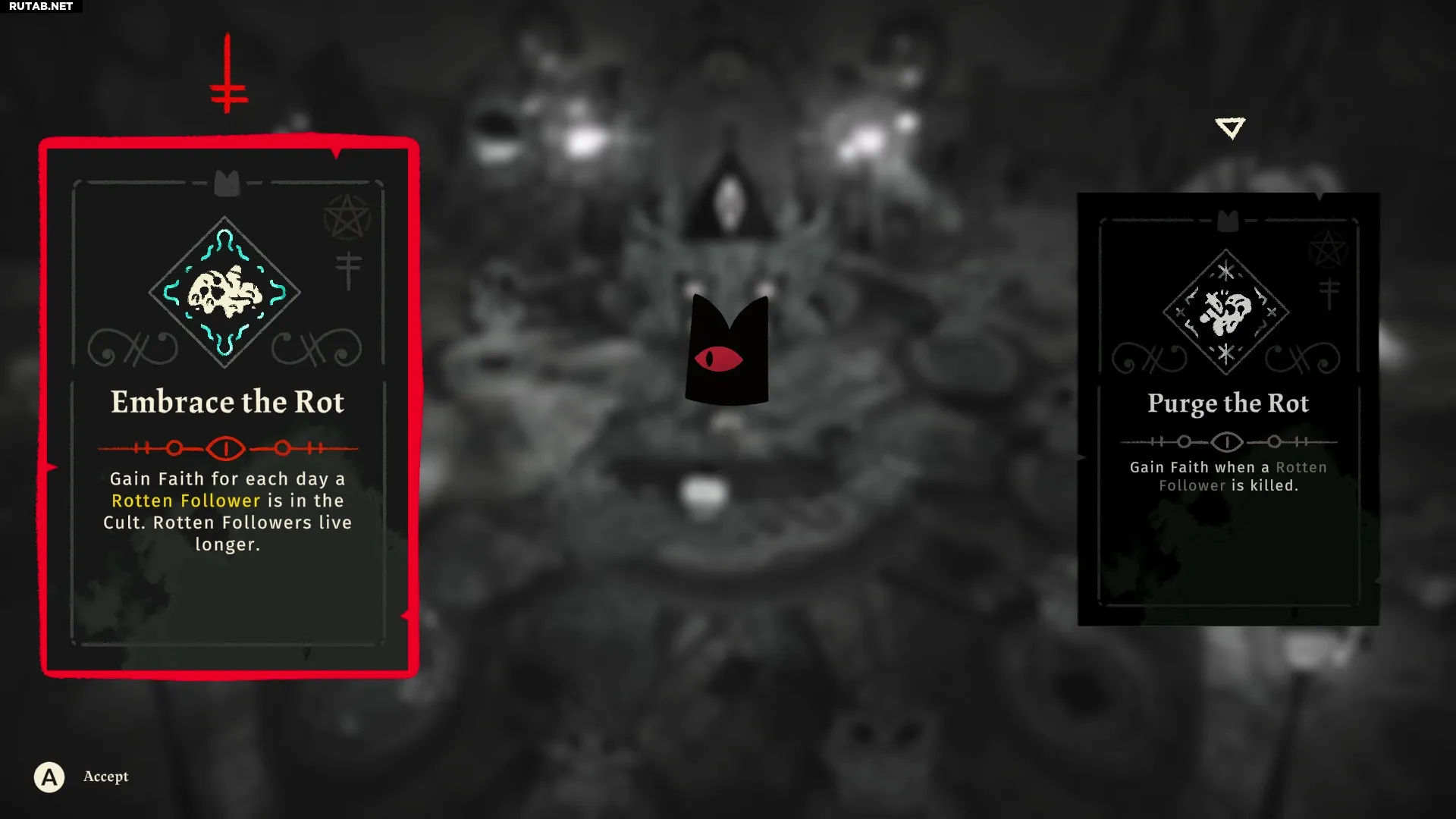 - Embrace the Rot (Принять гниение): Вы получаете Веру за каждый день, который гниющий последователь проводит в культе. Кроме того, продолжительность жизни таких последователей увеличивается.