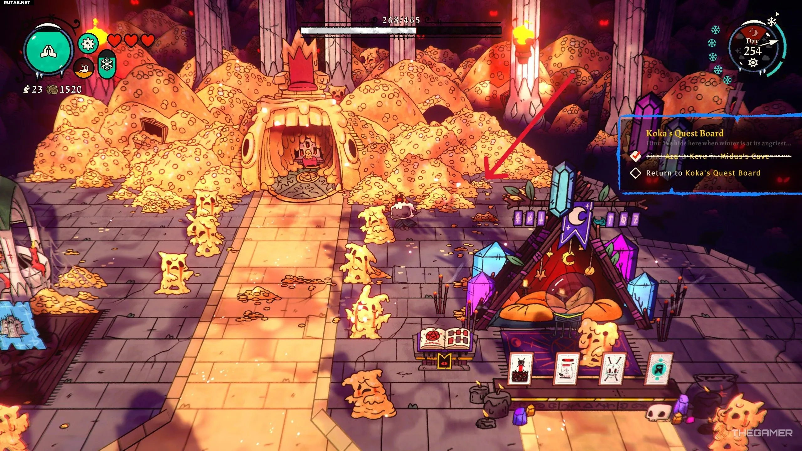 Когда они исчезнут, вернитесь к доске заданий и взаимодействуйте с ней, чтобы получить карту Таро «Раскалённое сердце». Подобно Замороженному Сердцу, она накладывает на любого врага, который вас ударит, кратковременный эффект, если вы потеряете именно это сердце.